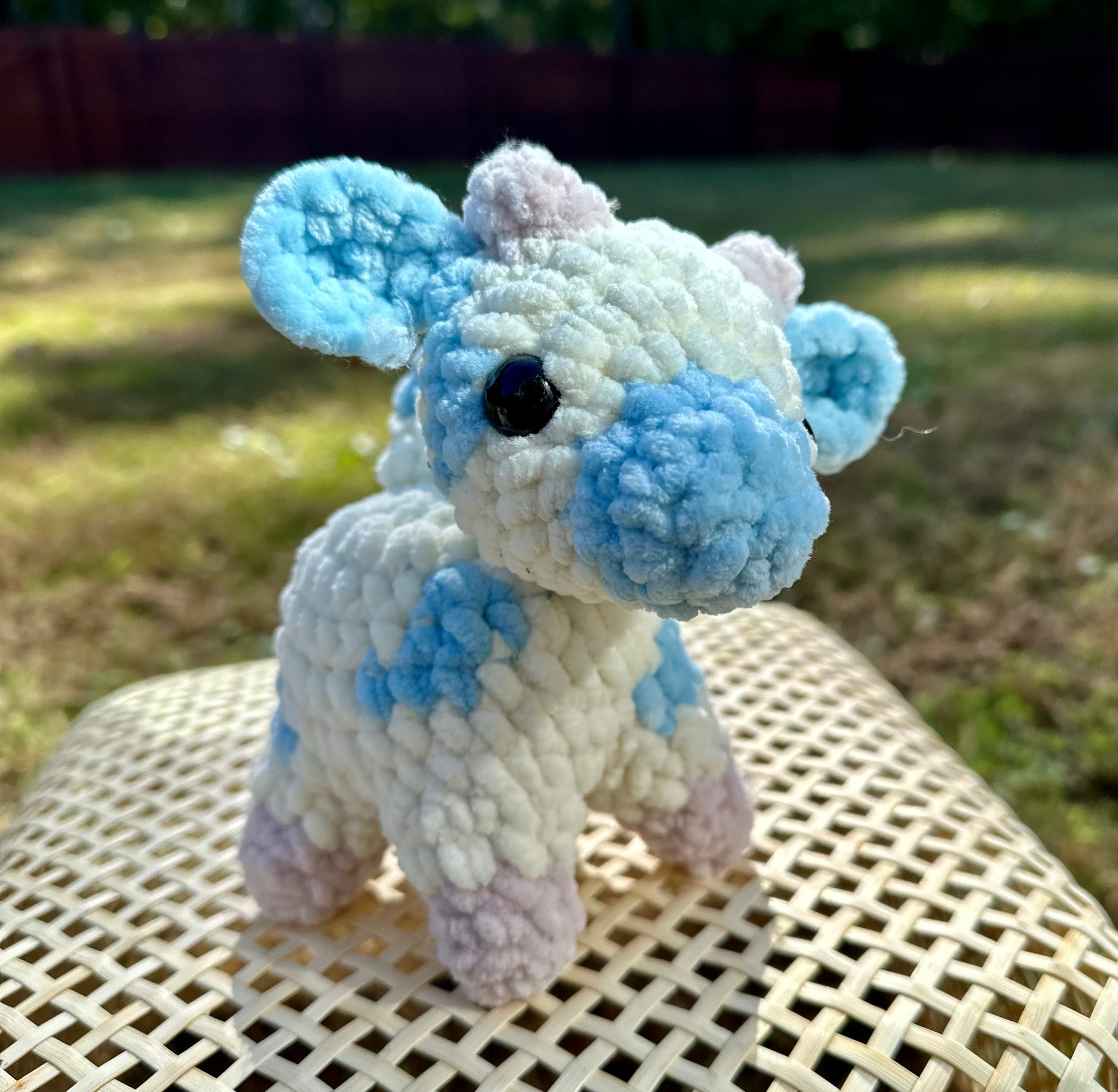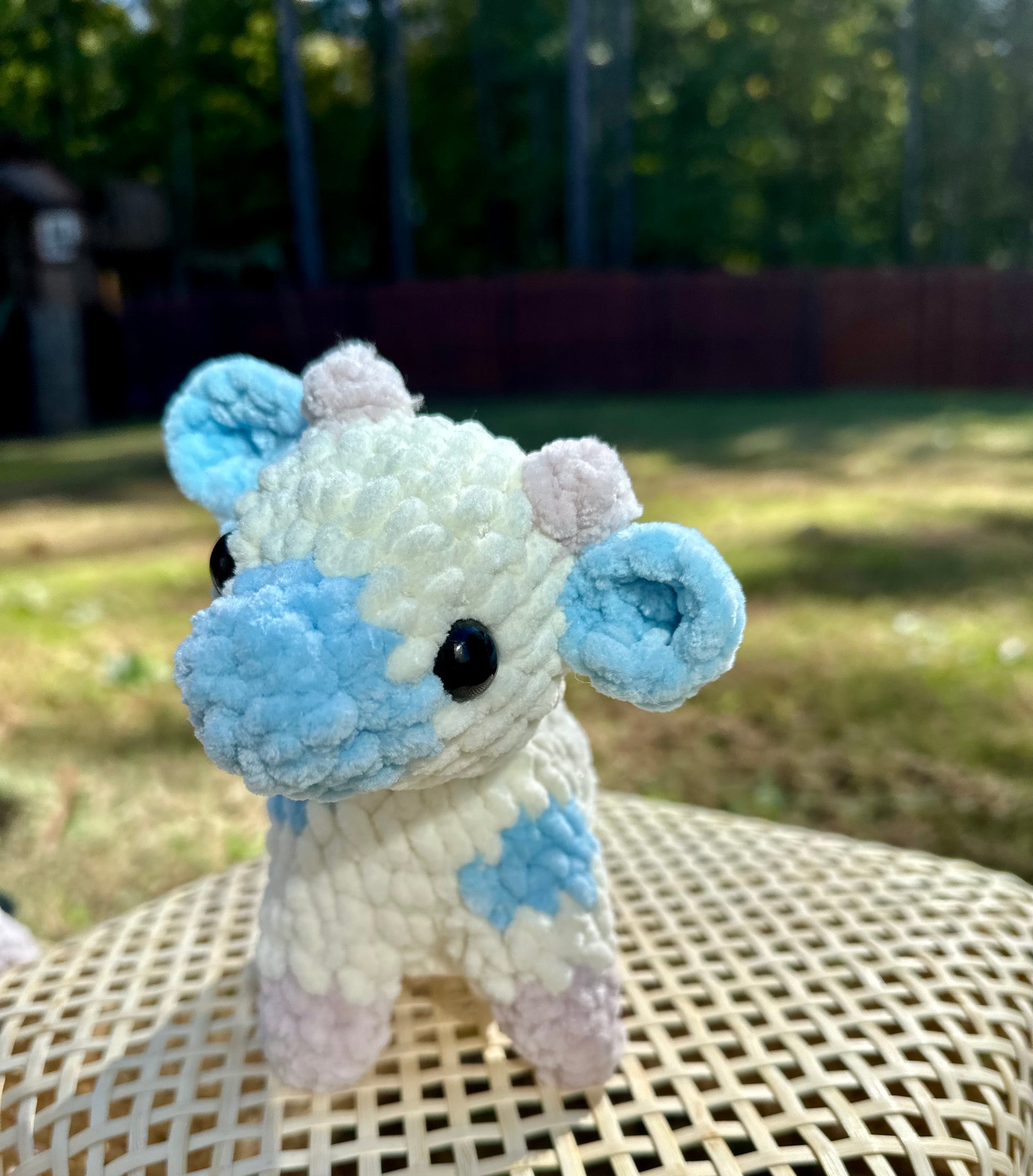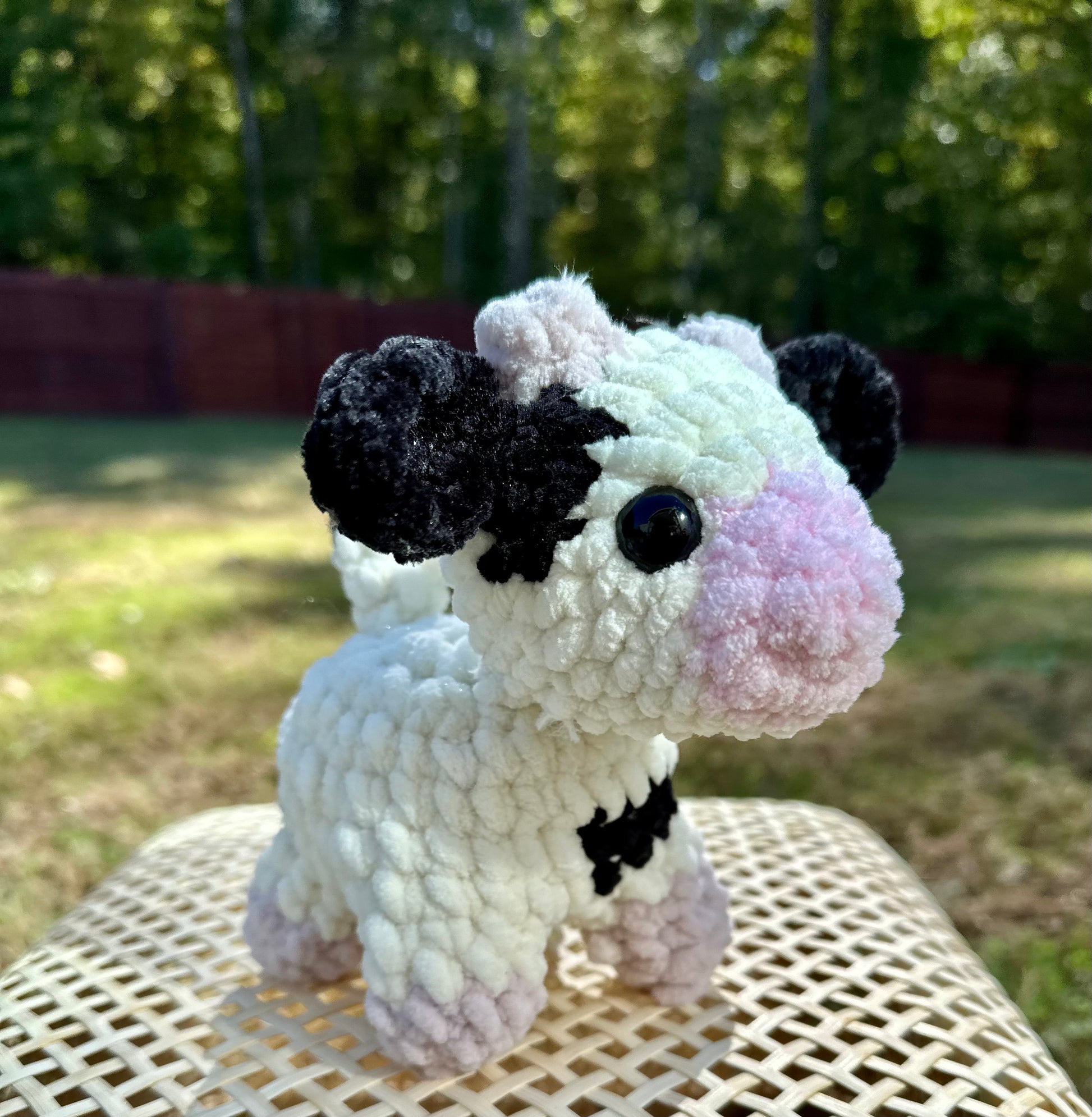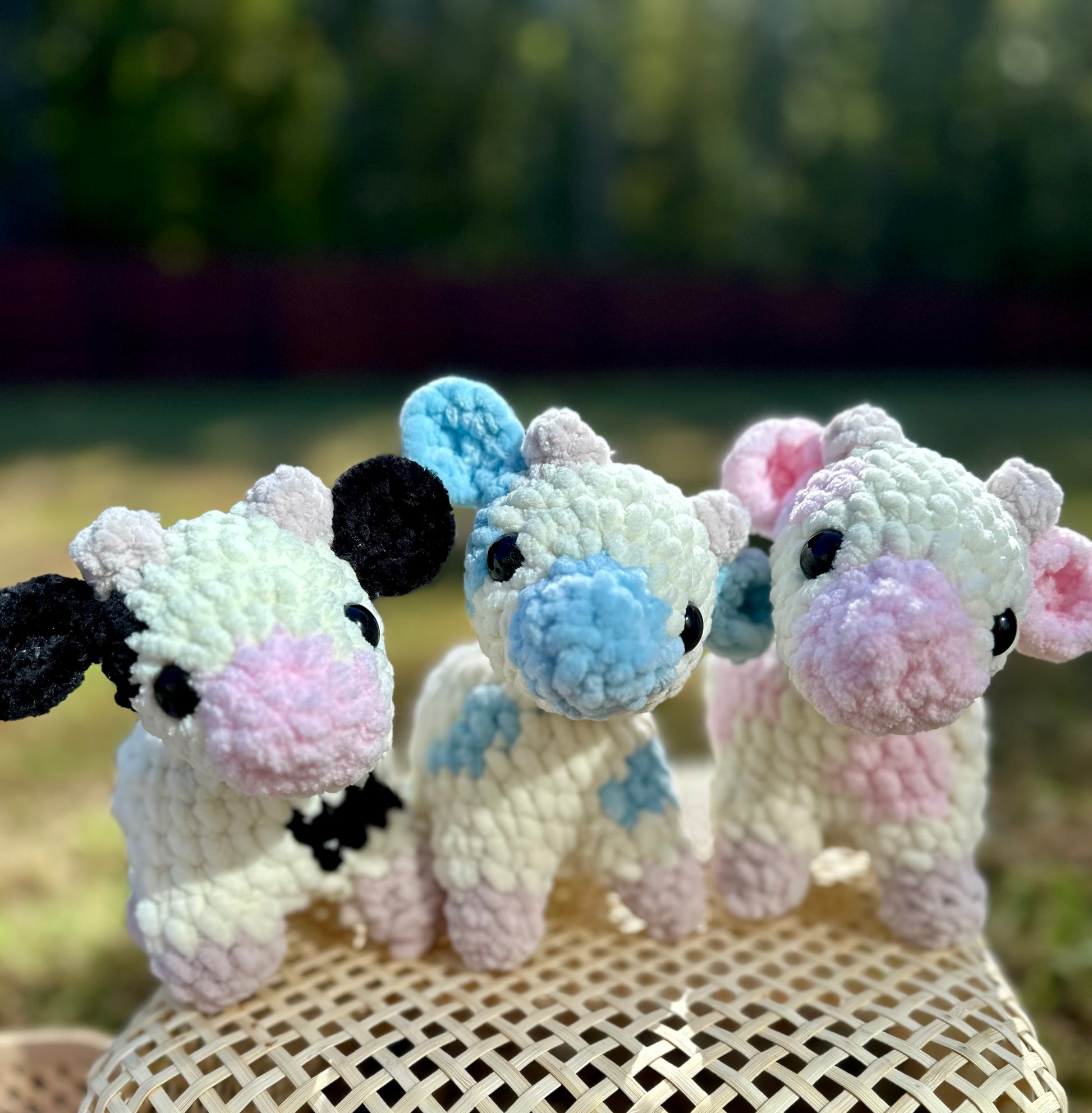 Handmade crochet baby cows that come in a variety of colors. Standing at 6 inches tall, these adorable cows are the perfect addition to any collection. Made with care and precision, these stuffed animals provide a unique and charming touch to any room.