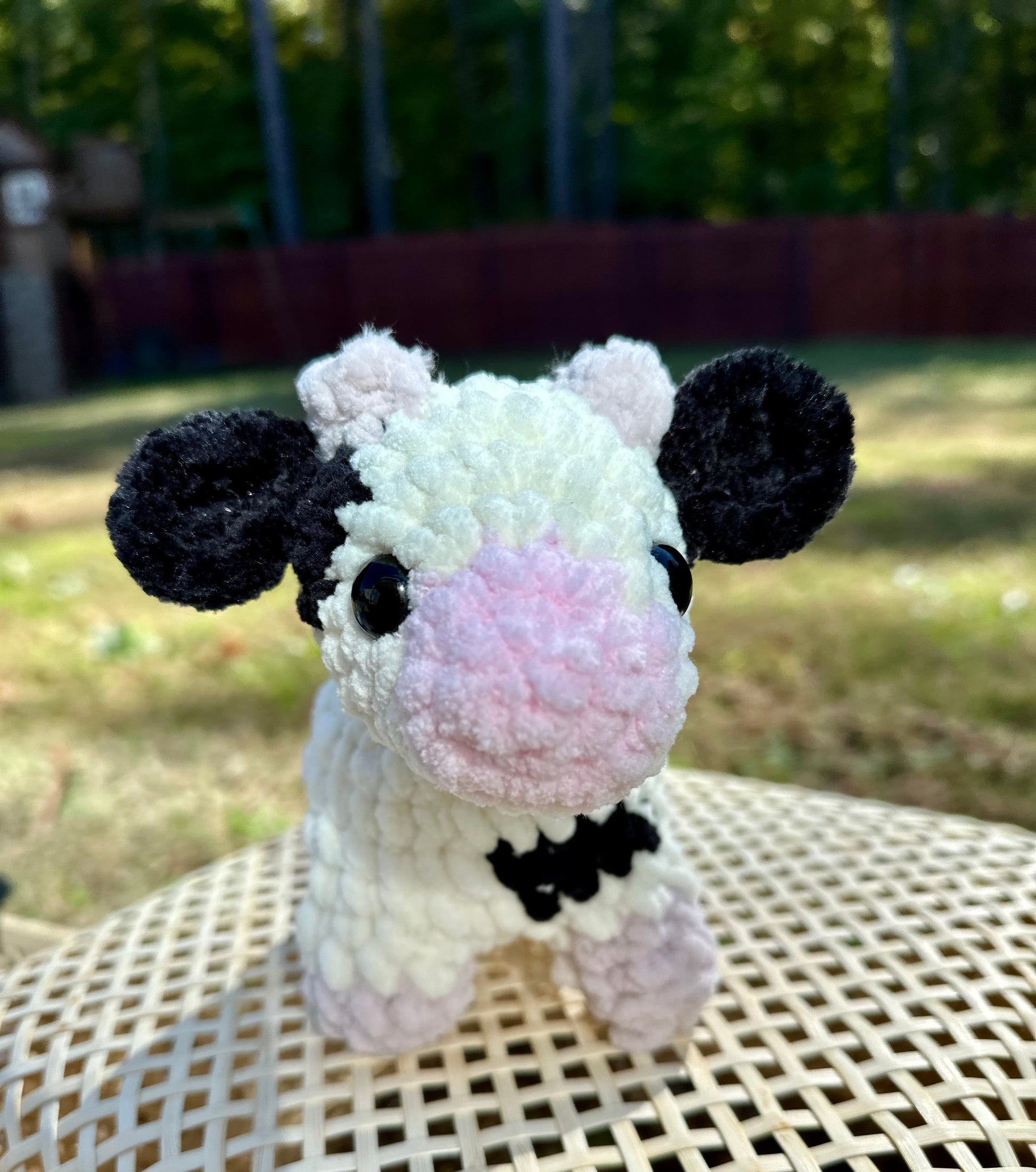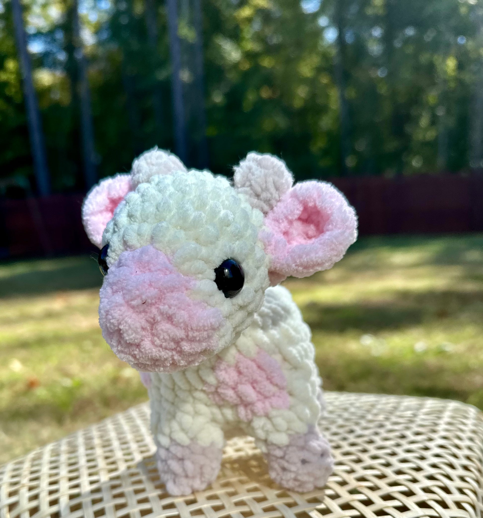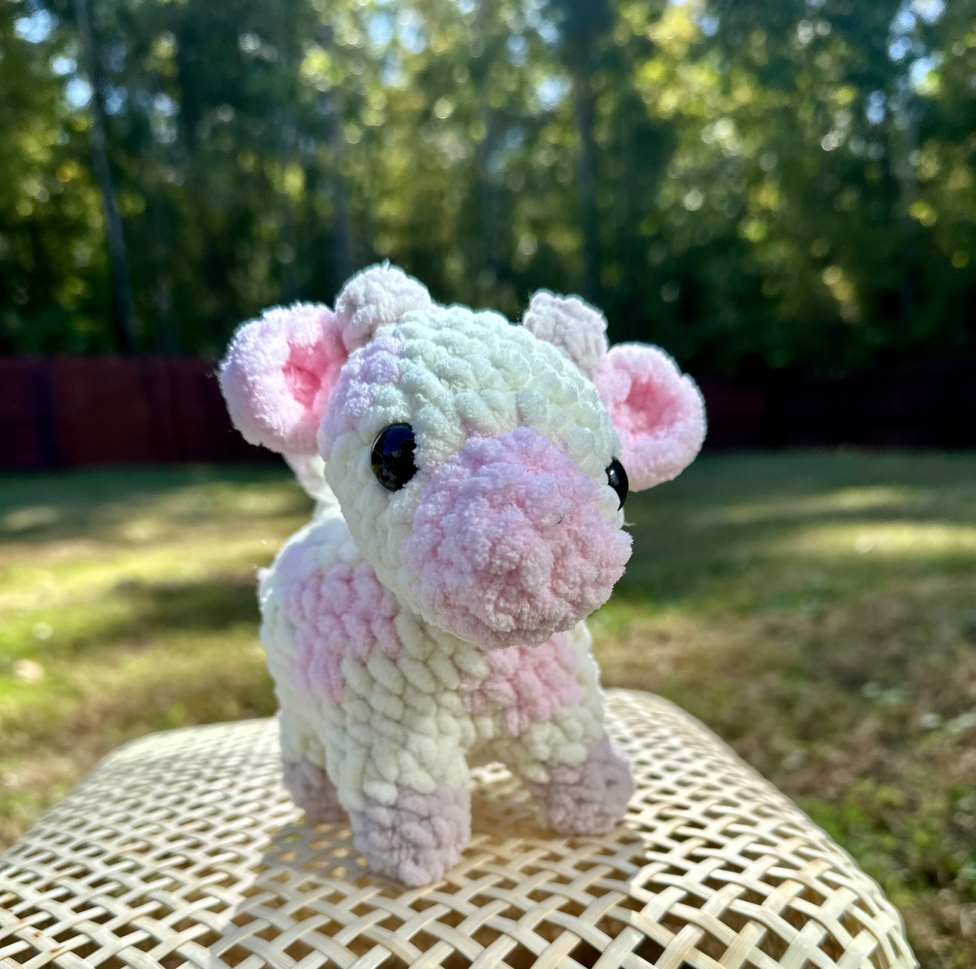 Handmade crochet baby cows that come in a variety of colors. Standing at 6 inches tall, these adorable cows are the perfect addition to any collection. Made with care and precision, these stuffed animals provide a unique and charming touch to any room.