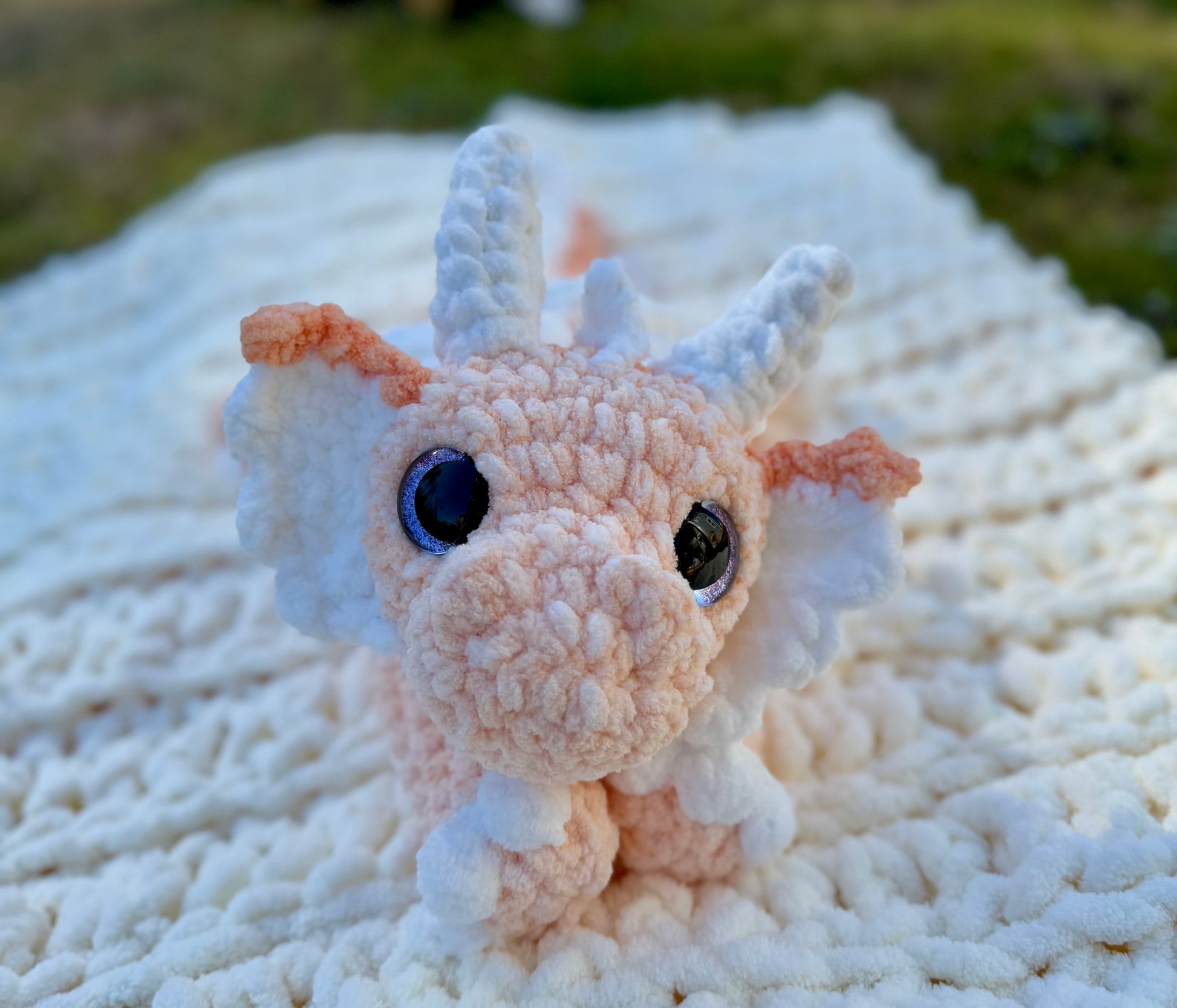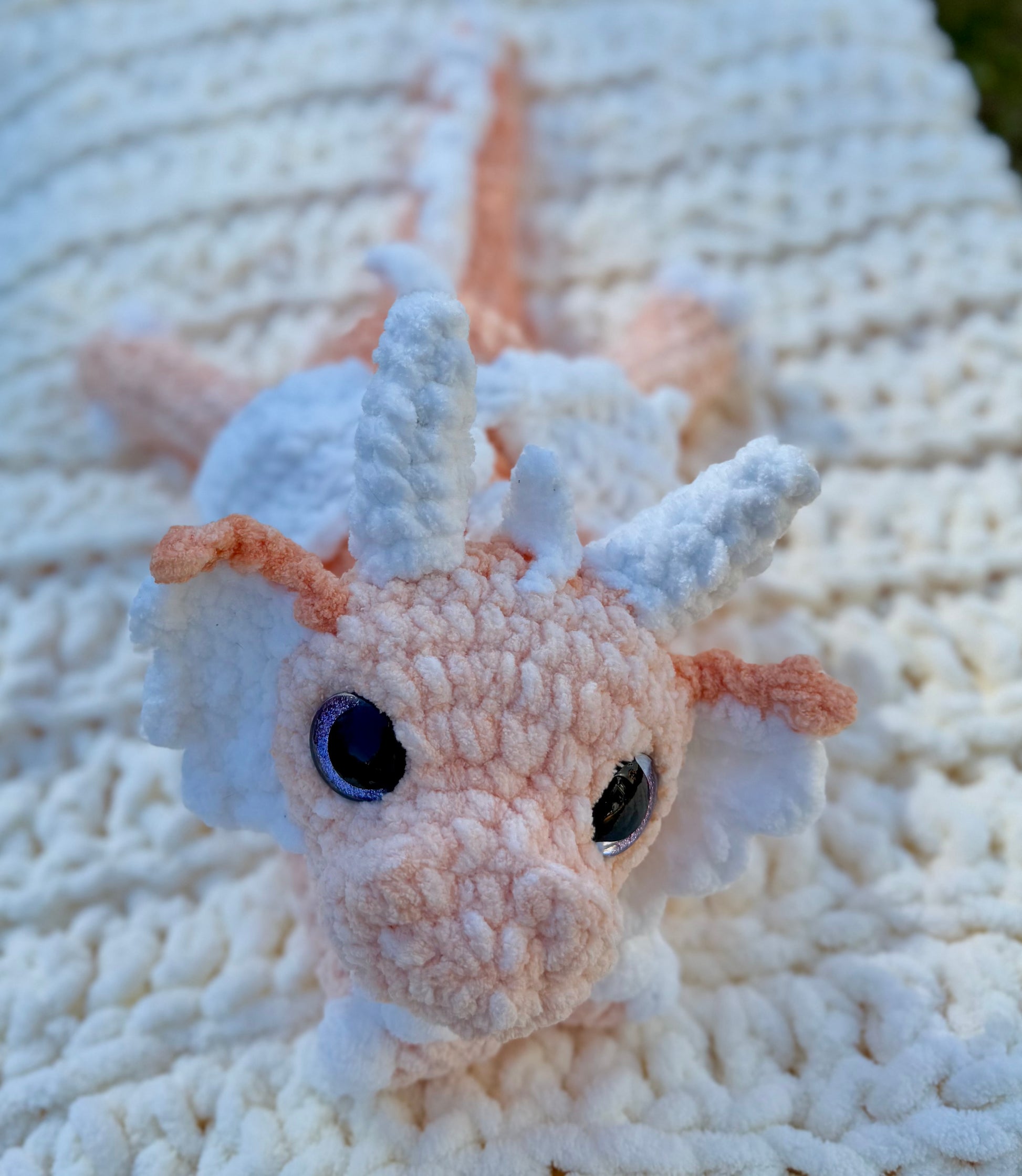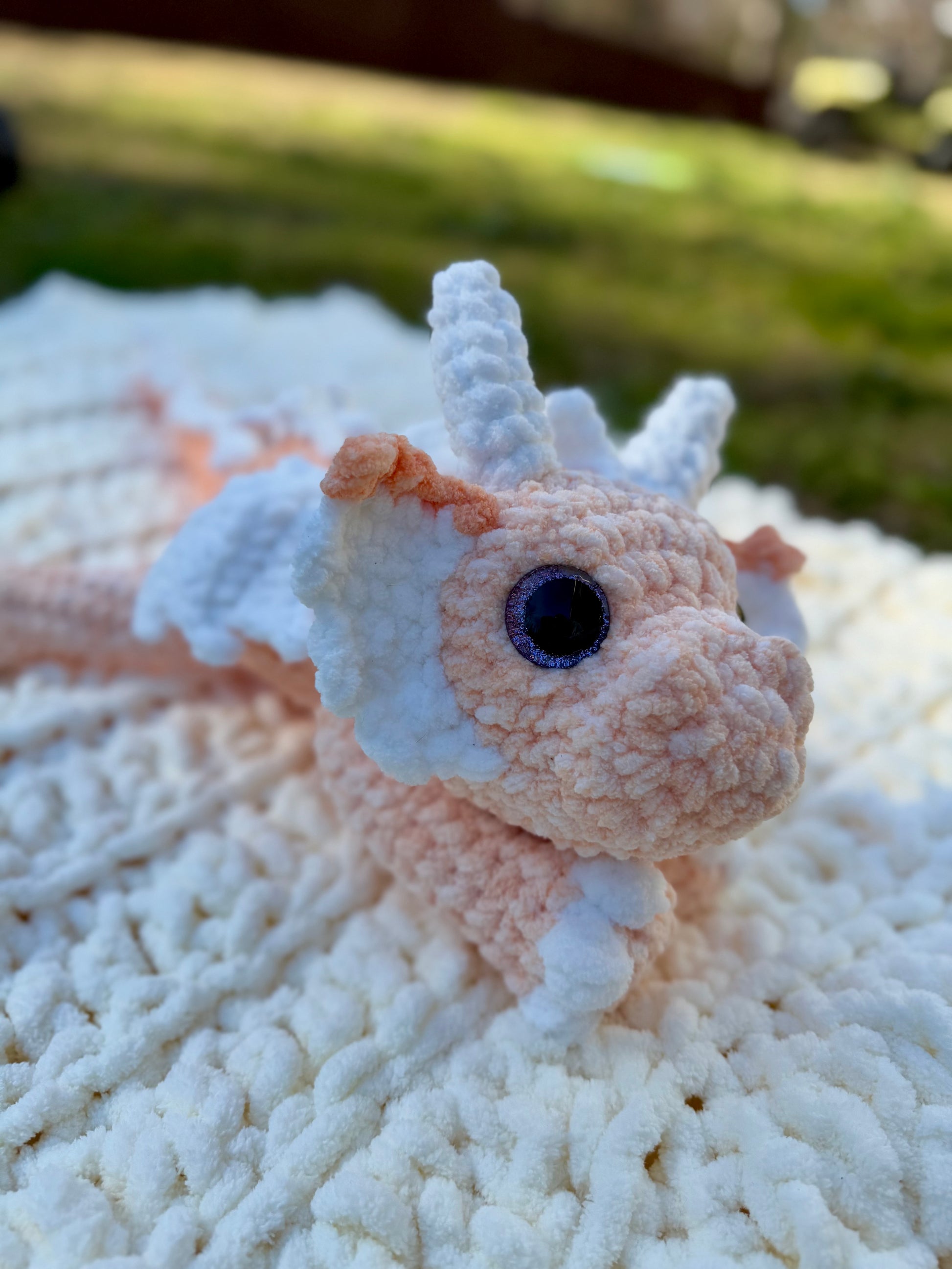 Introducing Snuggle Dragon - your mystical friend! This 26 inch long Creamsicle-colored dragon will bring warmth and comfort to anyone lucky enough to snuggle with it. Its magical presence will surely brighten up your day.