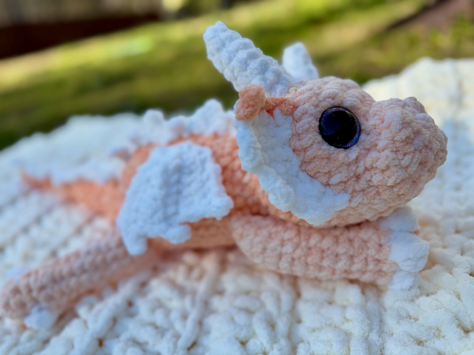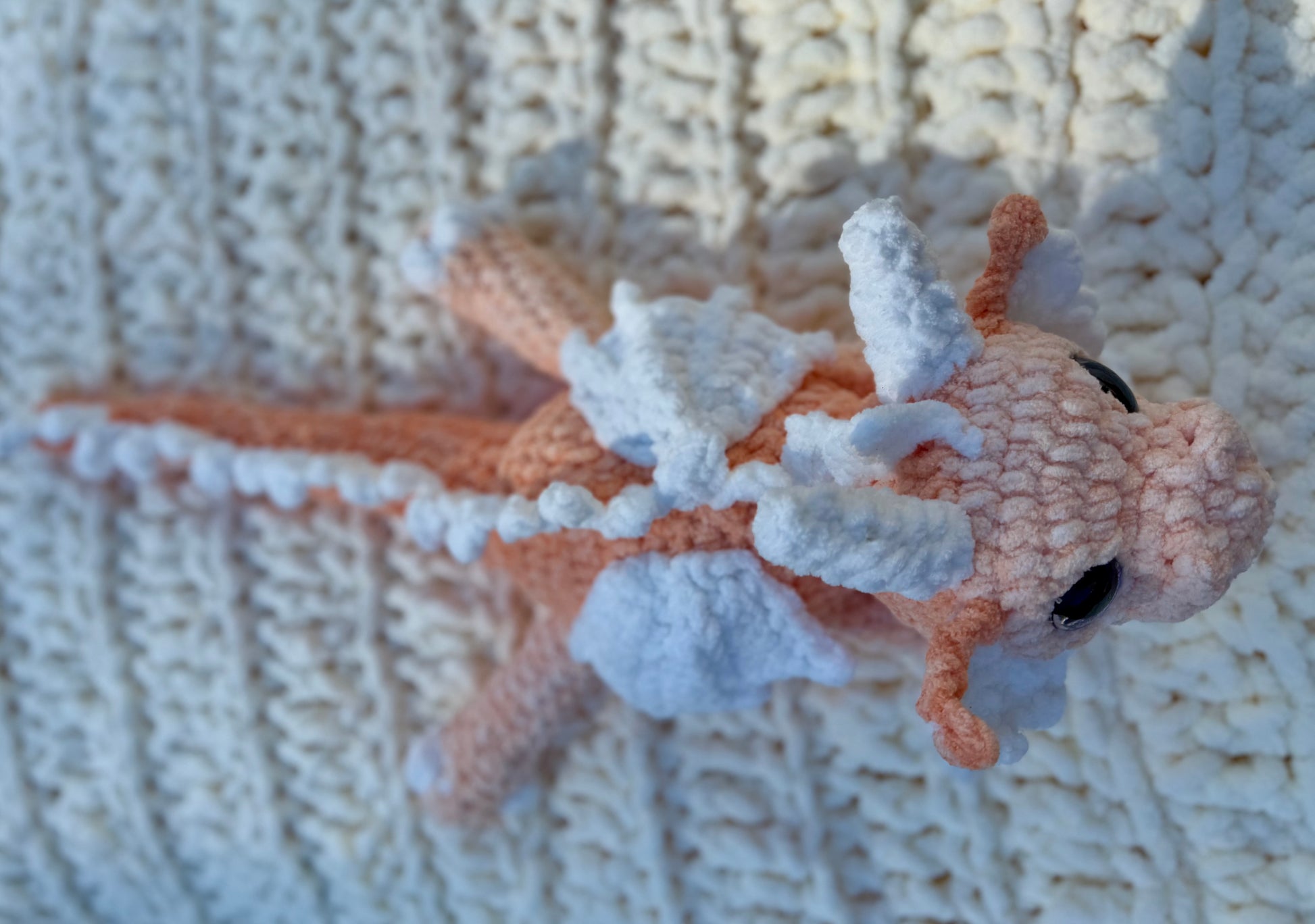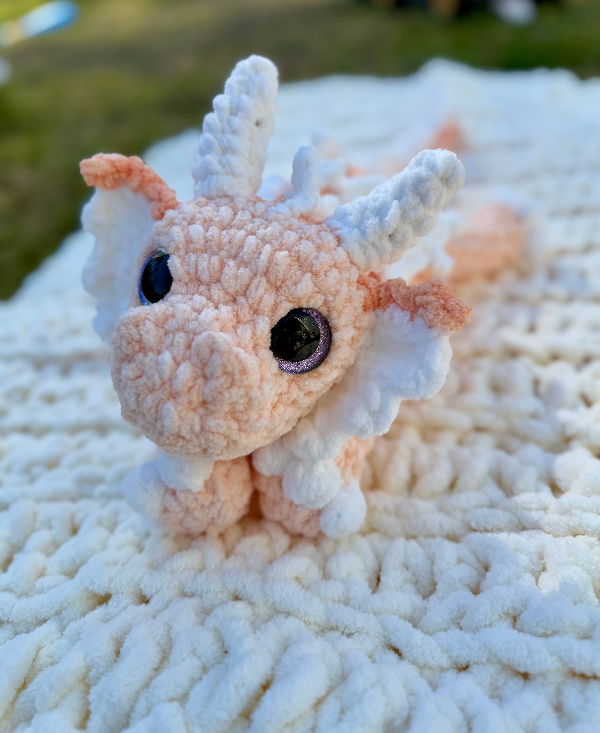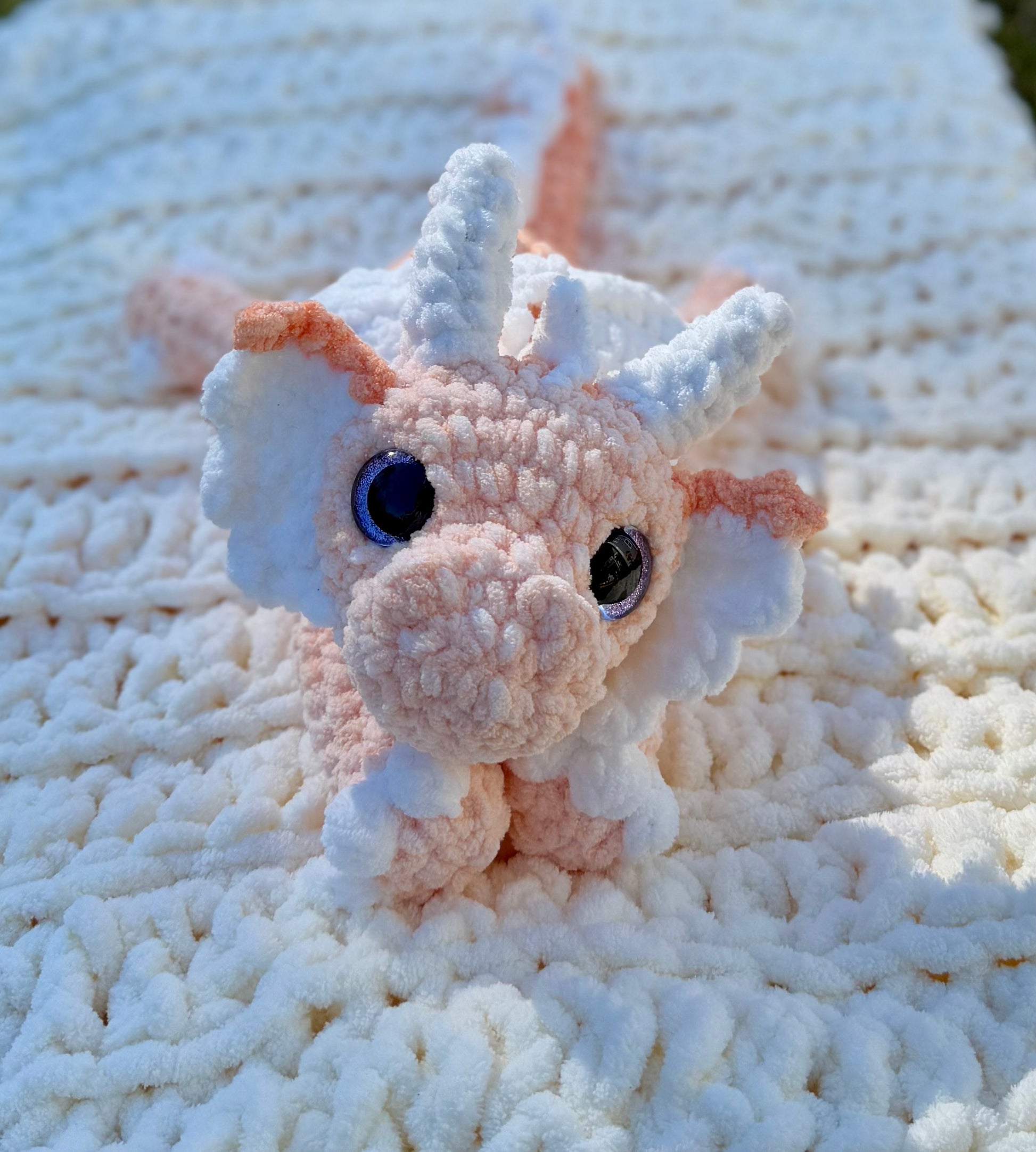 Introducing Snuggle Dragon - your mystical friend! This 26 inch long Creamsicle-colored dragon will bring warmth and comfort to anyone lucky enough to snuggle with it. Its magical presence will surely brighten up your day.