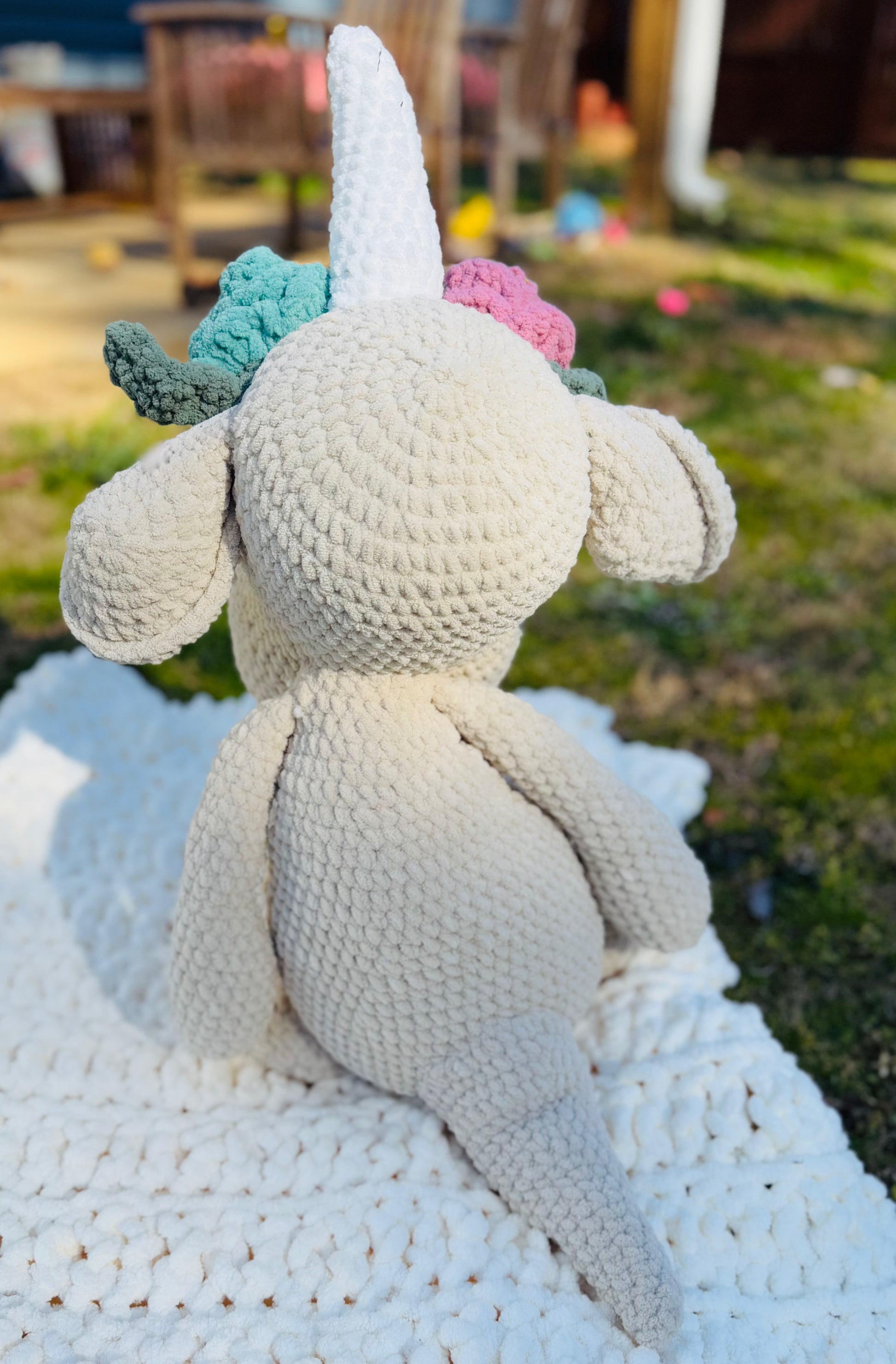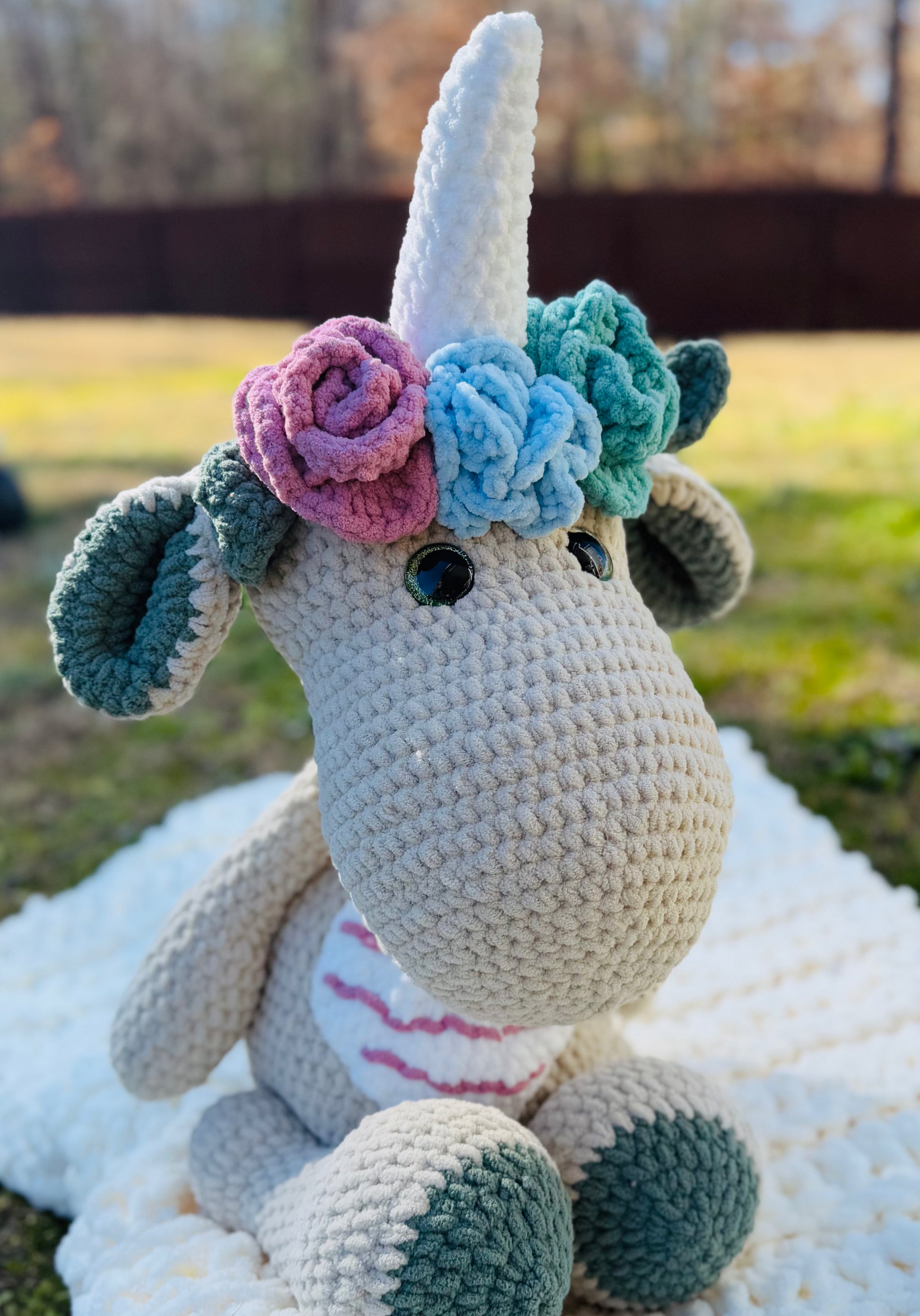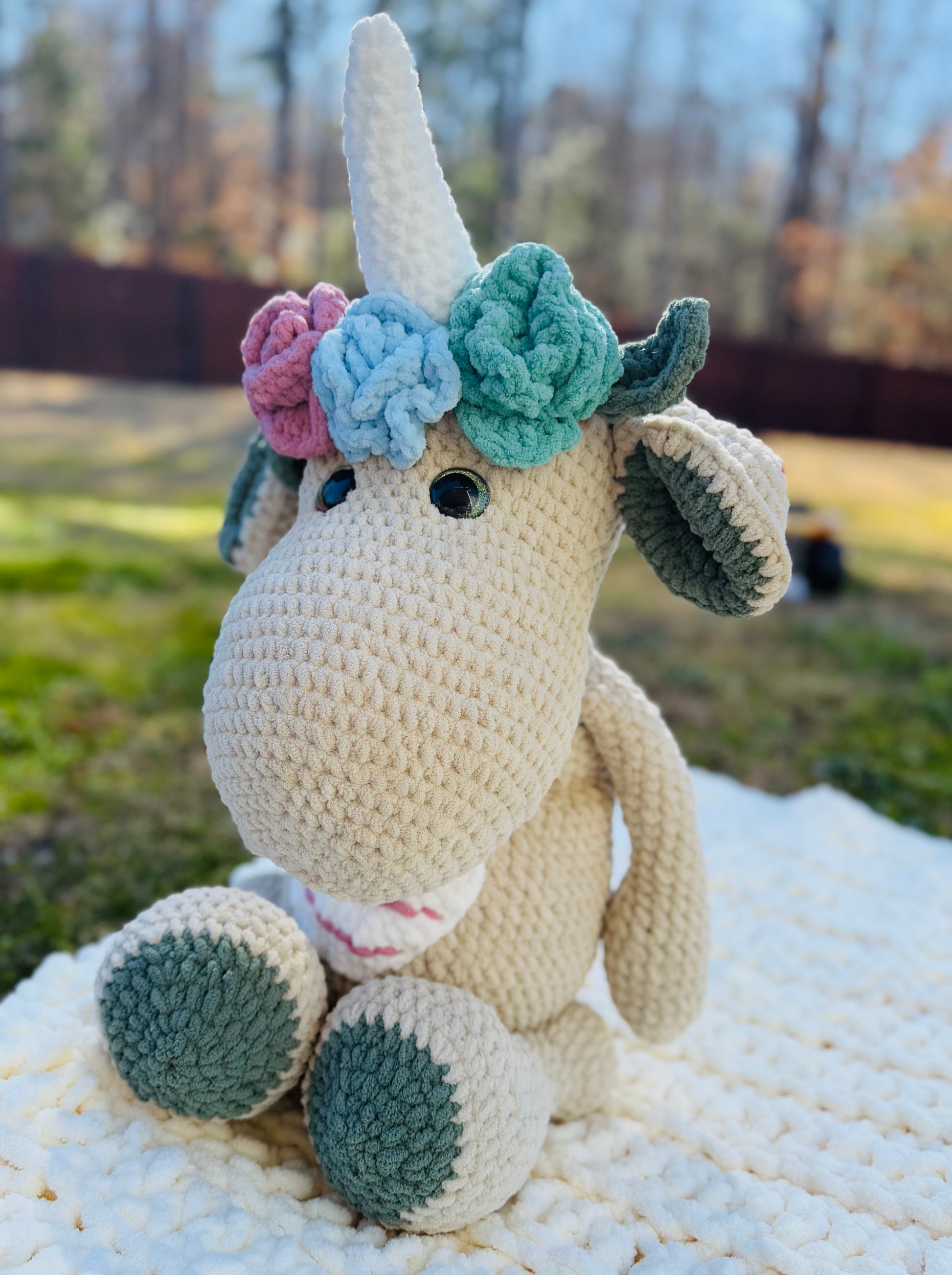 Introducing our 25-inch tall Huge handmade Unicorn Dinosaur Plush - the perfect cuddly companion for any dinosaur lover! Made with ultra soft materials, this plush is sure to provide endless comfort and adventure. With its impressive size, it's the ultimate addition to any collection.