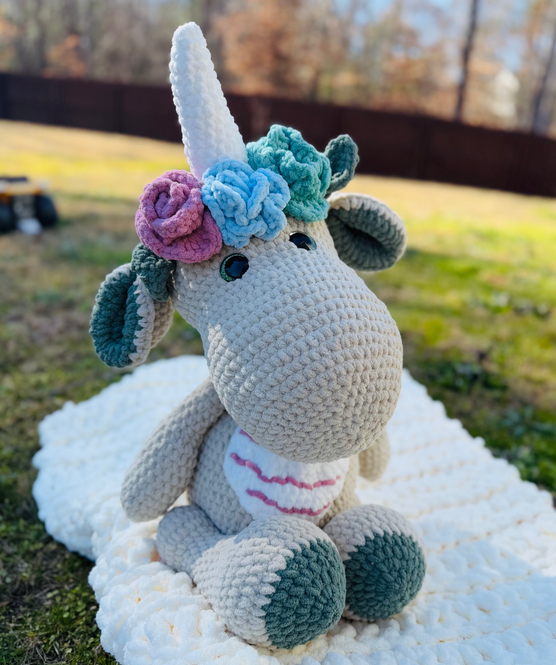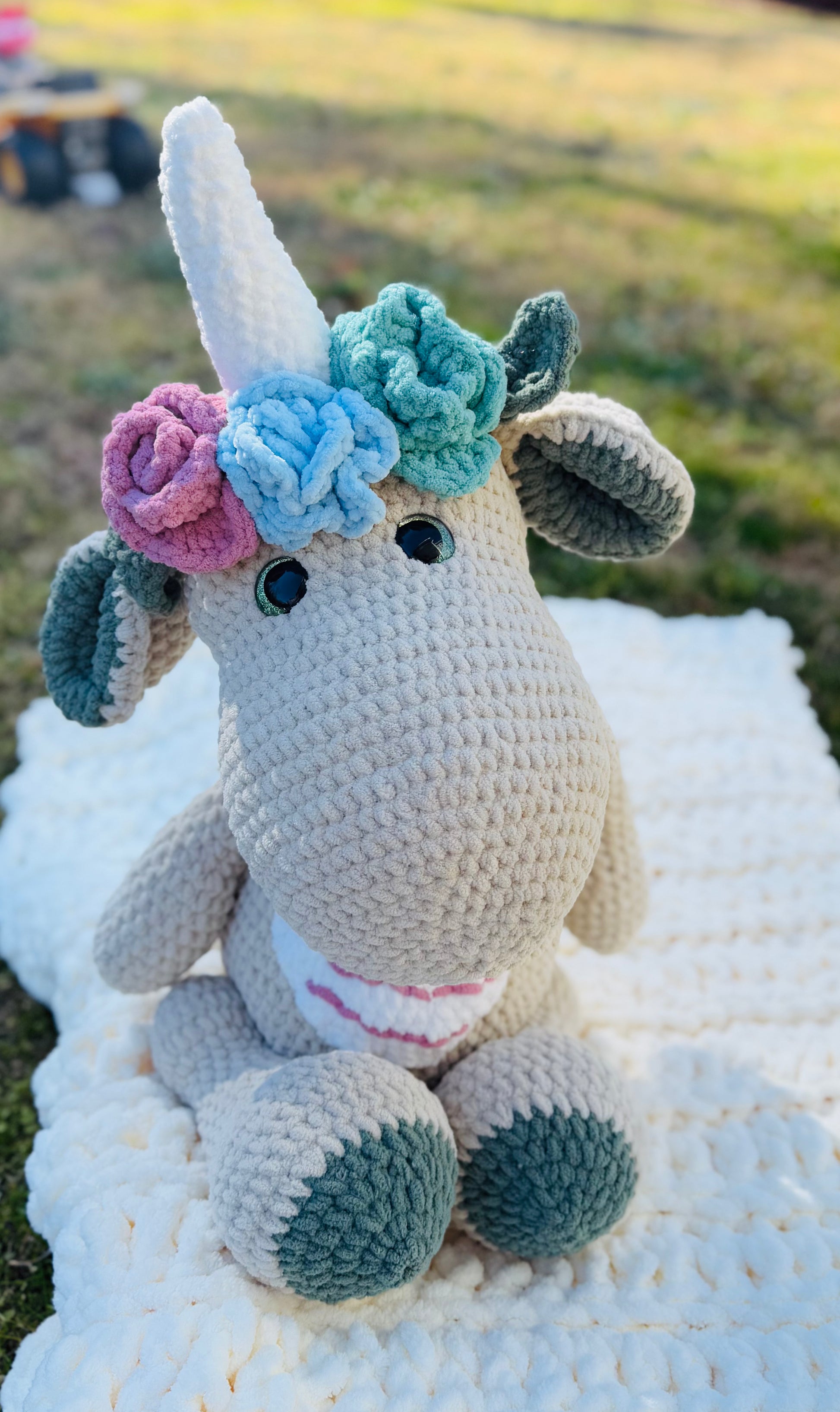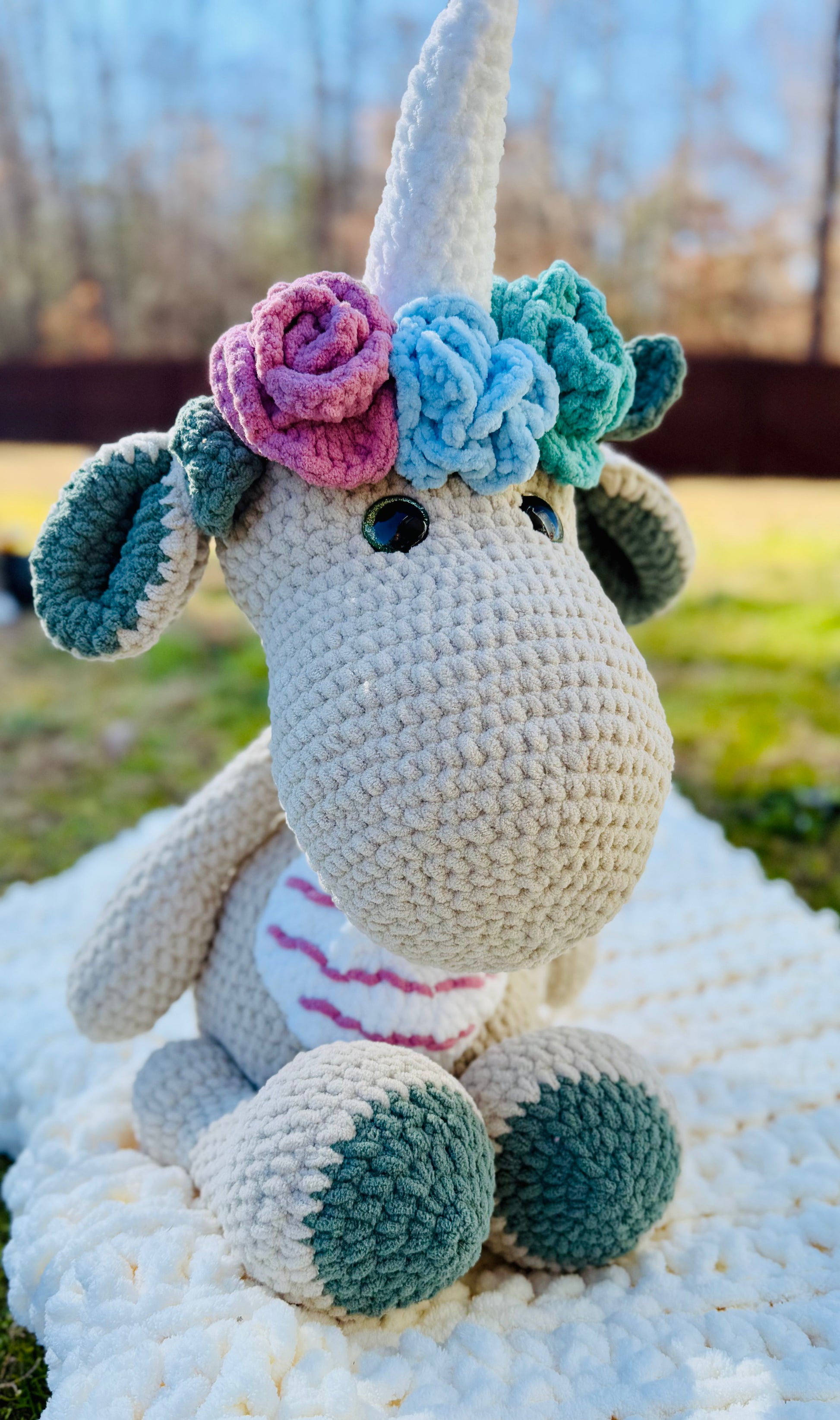 Introducing our 25-inch tall Huge handmade Unicorn Dinosaur Plush - the perfect cuddly companion for any dinosaur lover! Made with ultra soft materials, this plush is sure to provide endless comfort and adventure. With its impressive size, it's the ultimate addition to any collection.