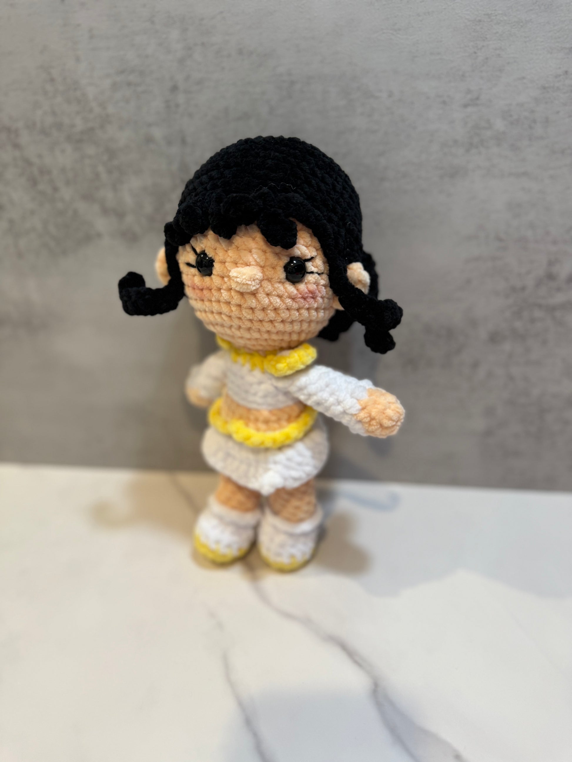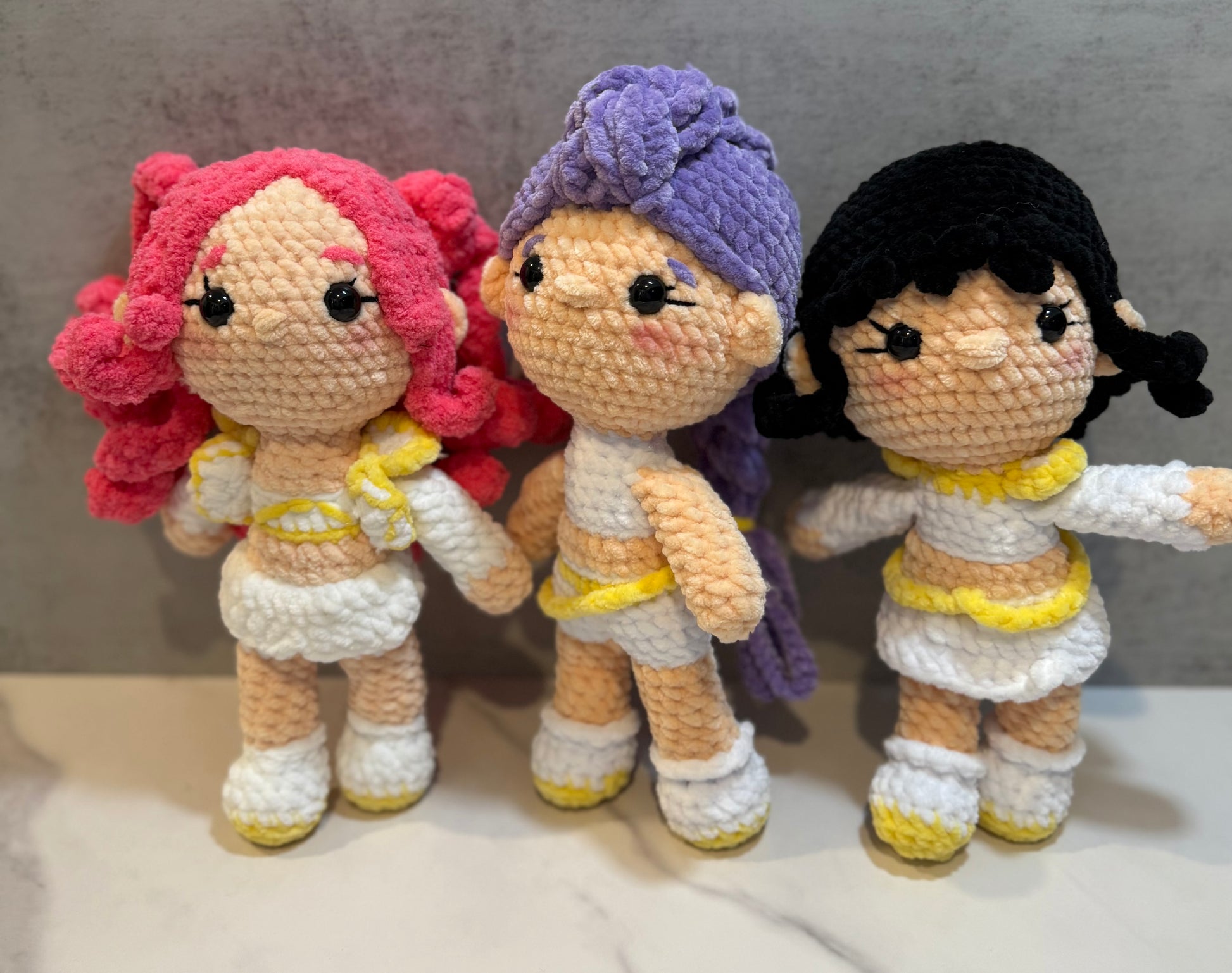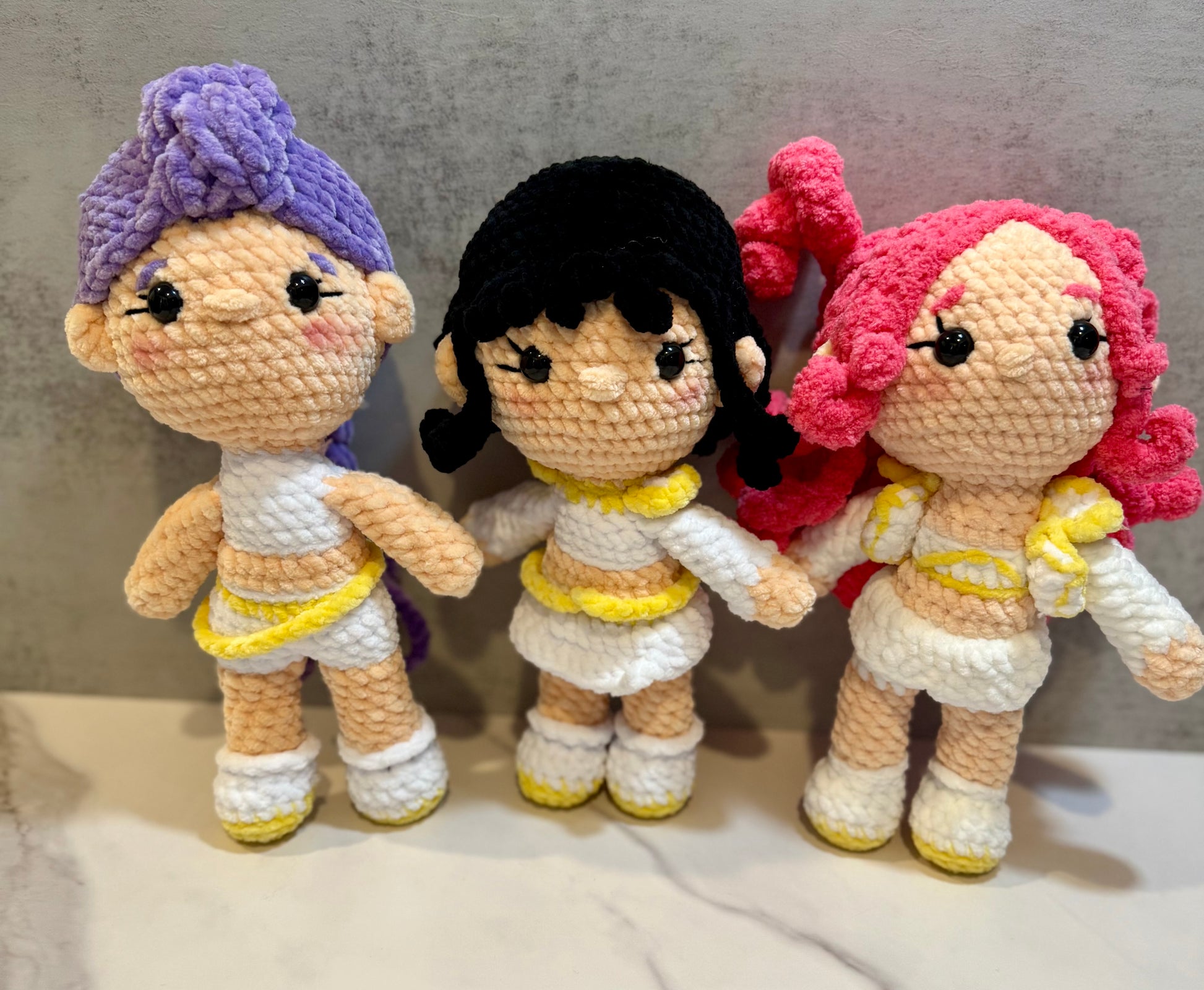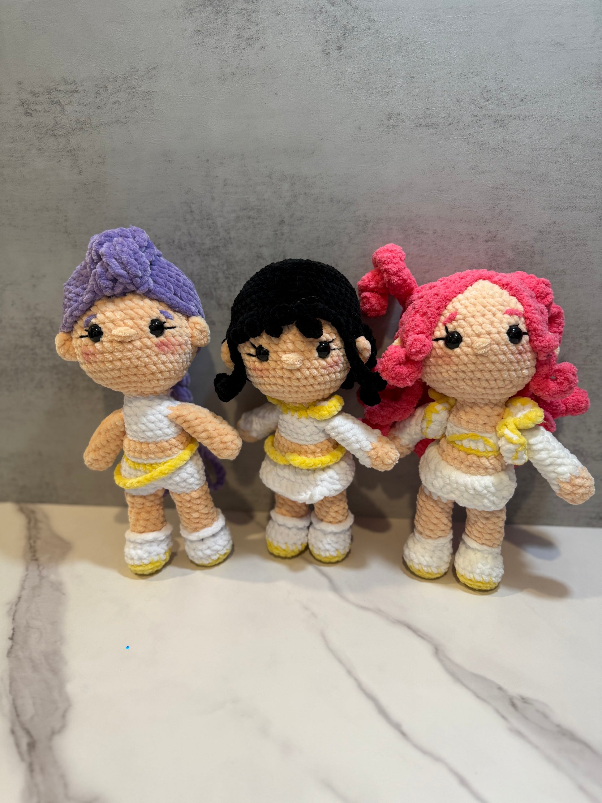 Join the K-pop demon hunters Rumi, Zoey, and Mira on their stylish adventures in their golden outfits. Defeat demons in style with this fearless crochet trio! Perfect for any K-pop fan looking for a little extra magic in their collection!
