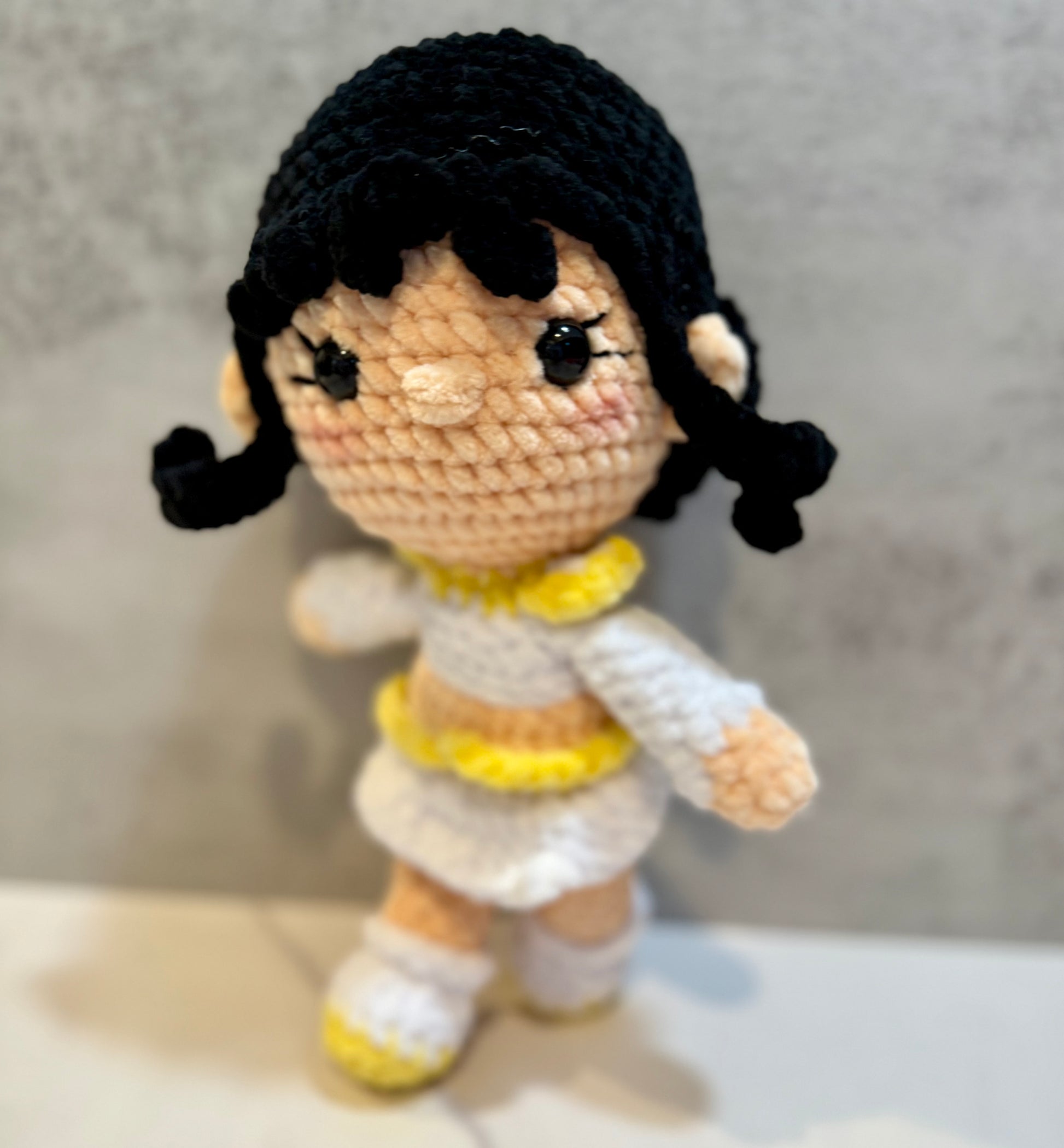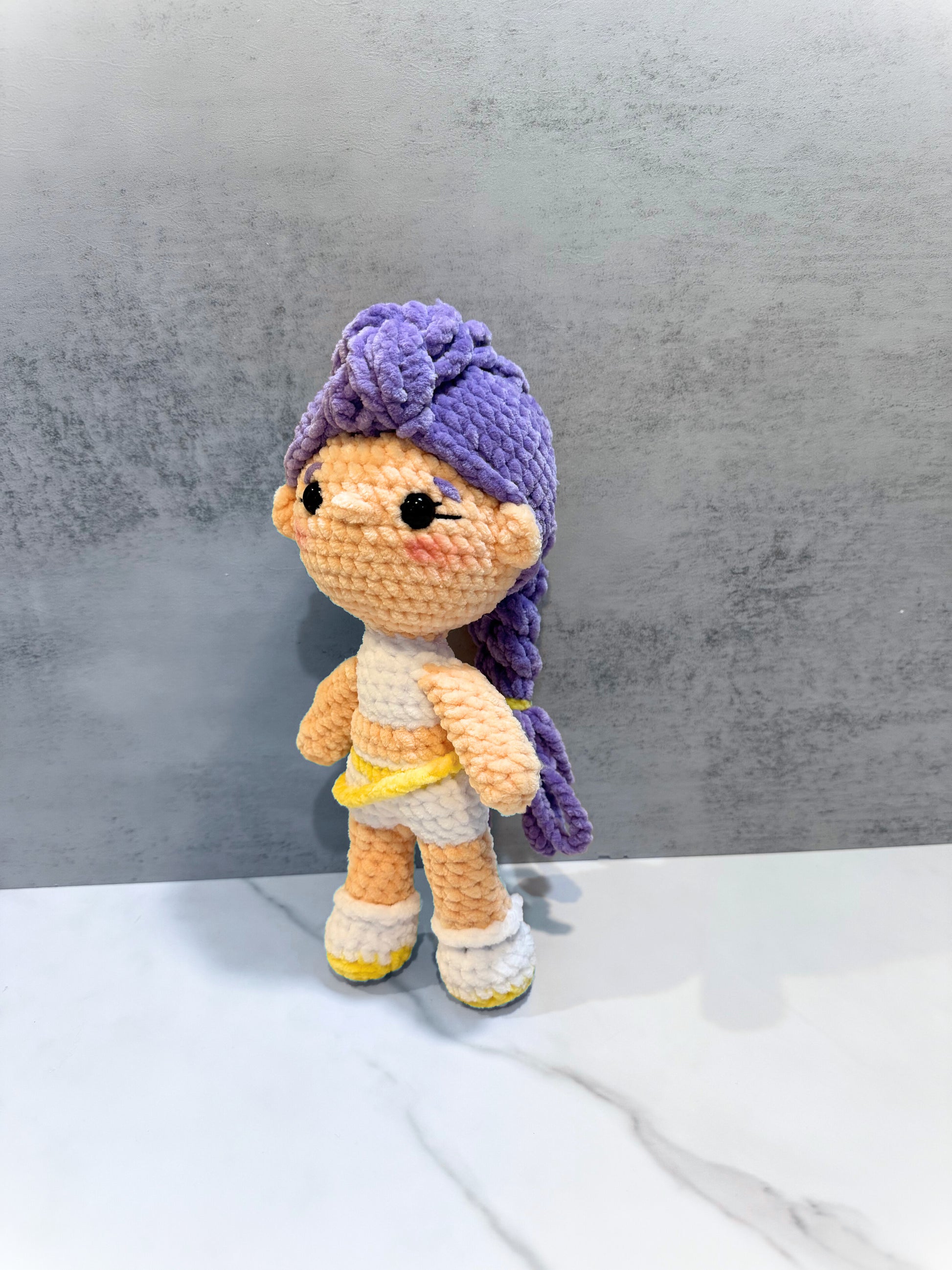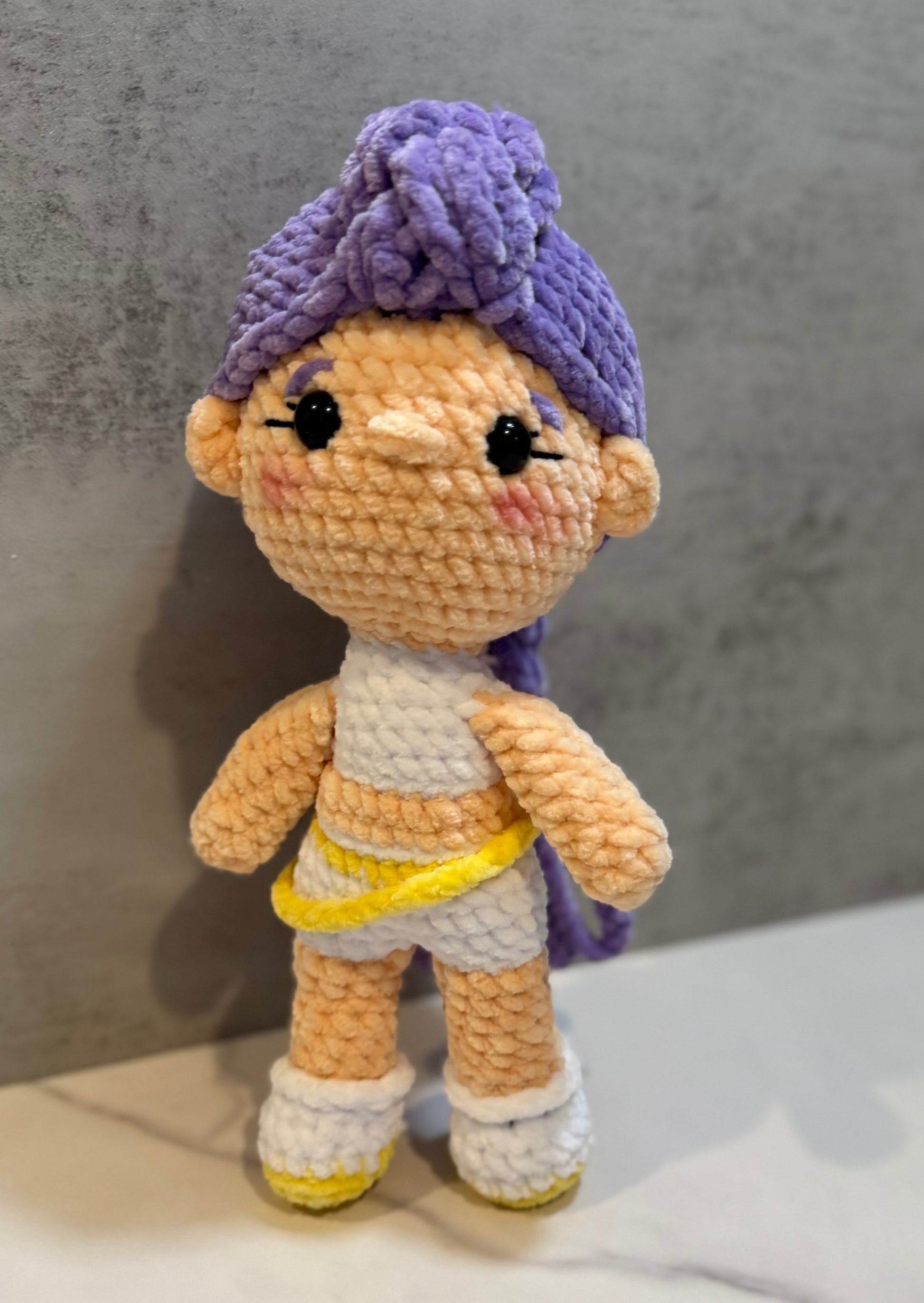 Join the K-pop demon hunters Rumi, Zoey, and Mira on their stylish adventures in their golden outfits. Defeat demons in style with this fearless crochet trio! Perfect for any K-pop fan looking for a little extra magic in their collection!
