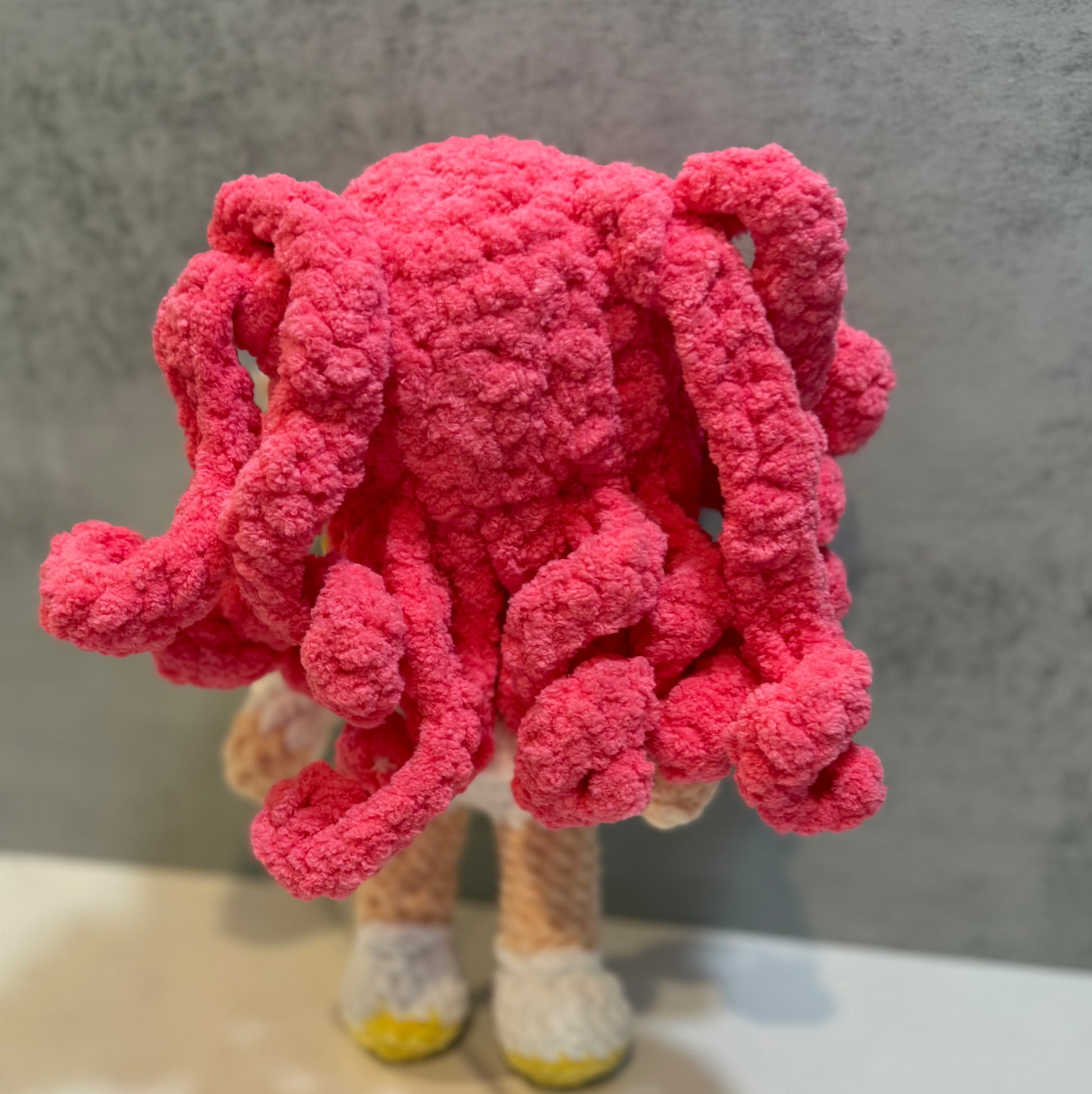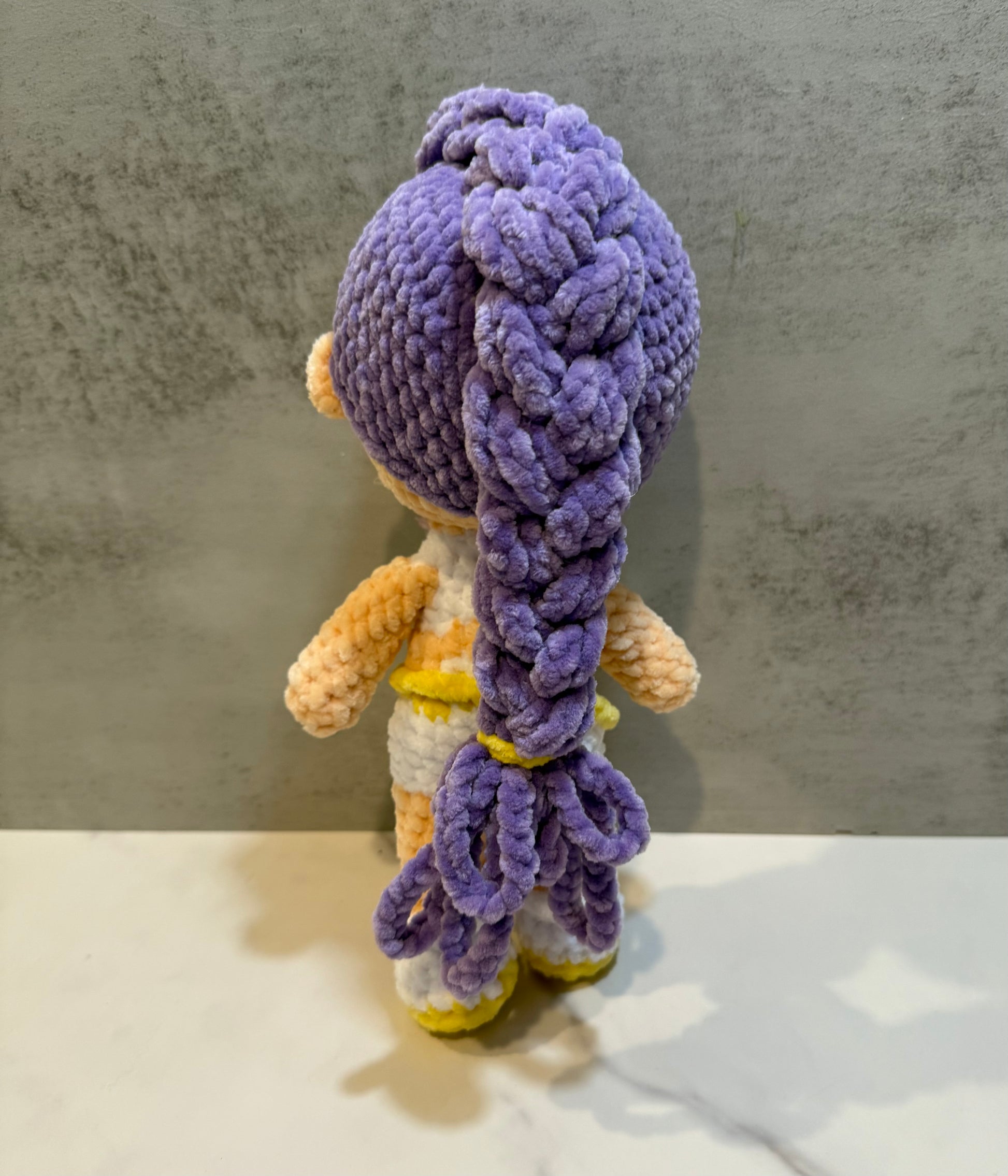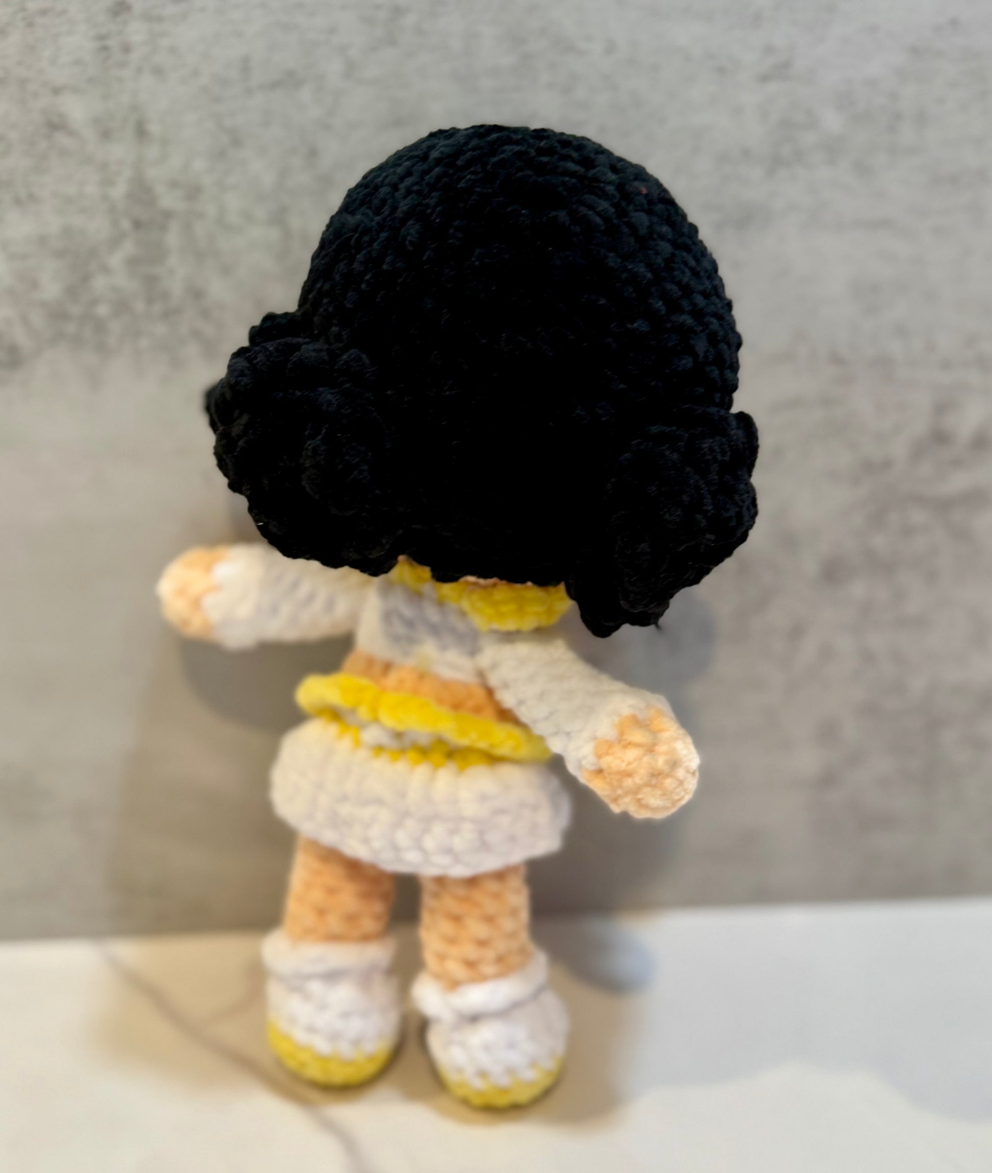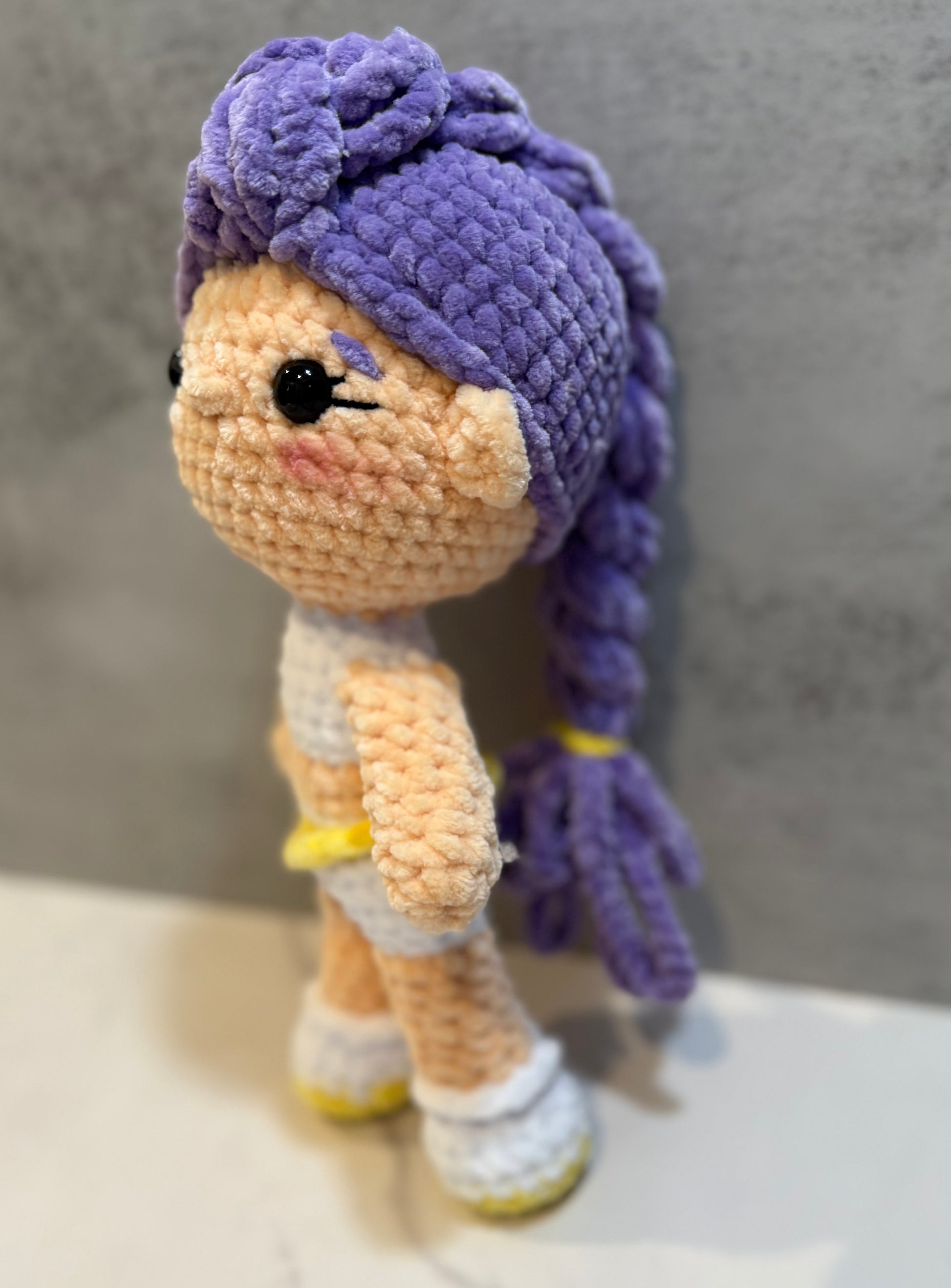 Join the K-pop demon hunters Rumi, Zoey, and Mira on their stylish adventures in their golden outfits. Defeat demons in style with this fearless crochet trio! Perfect for any K-pop fan looking for a little extra magic in their collection!