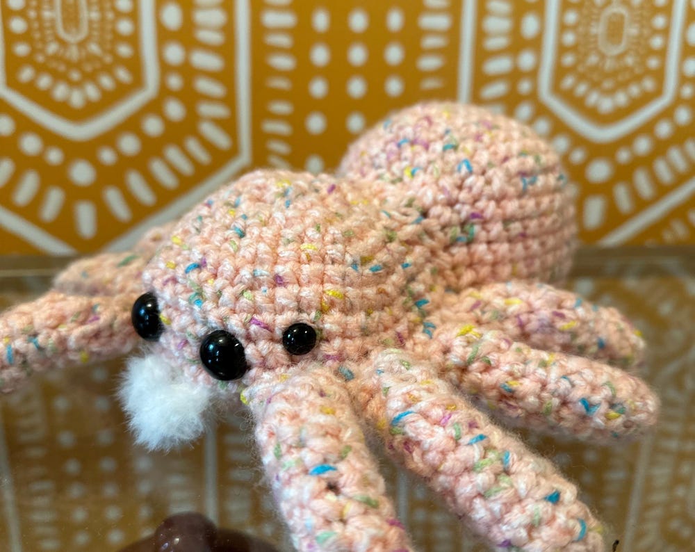 This little jumping spider was crocheted by me <3. She is 8 inches from eyes to the tip of her abdomen. All my crochet items can be hand washed.