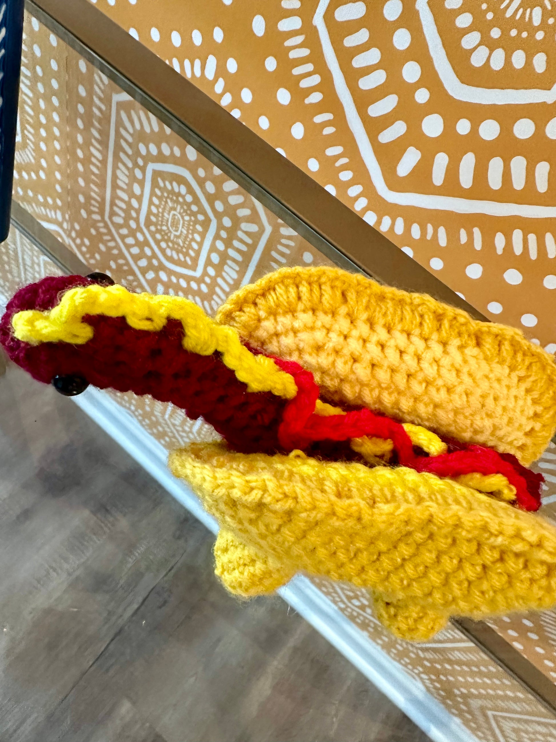 Ever needed a hotdog dinosaur? Well, we have you covered. This Dino is sandwiched between a hotdog bun. He is topped with ketchup and mustard. The hotdog detaches for more fun!