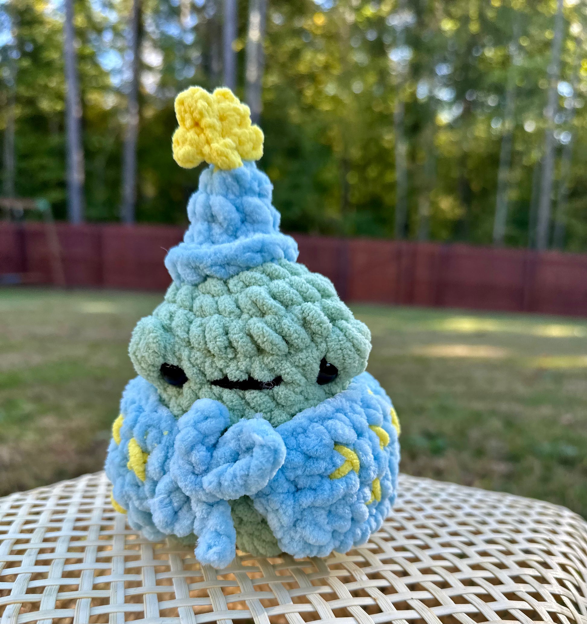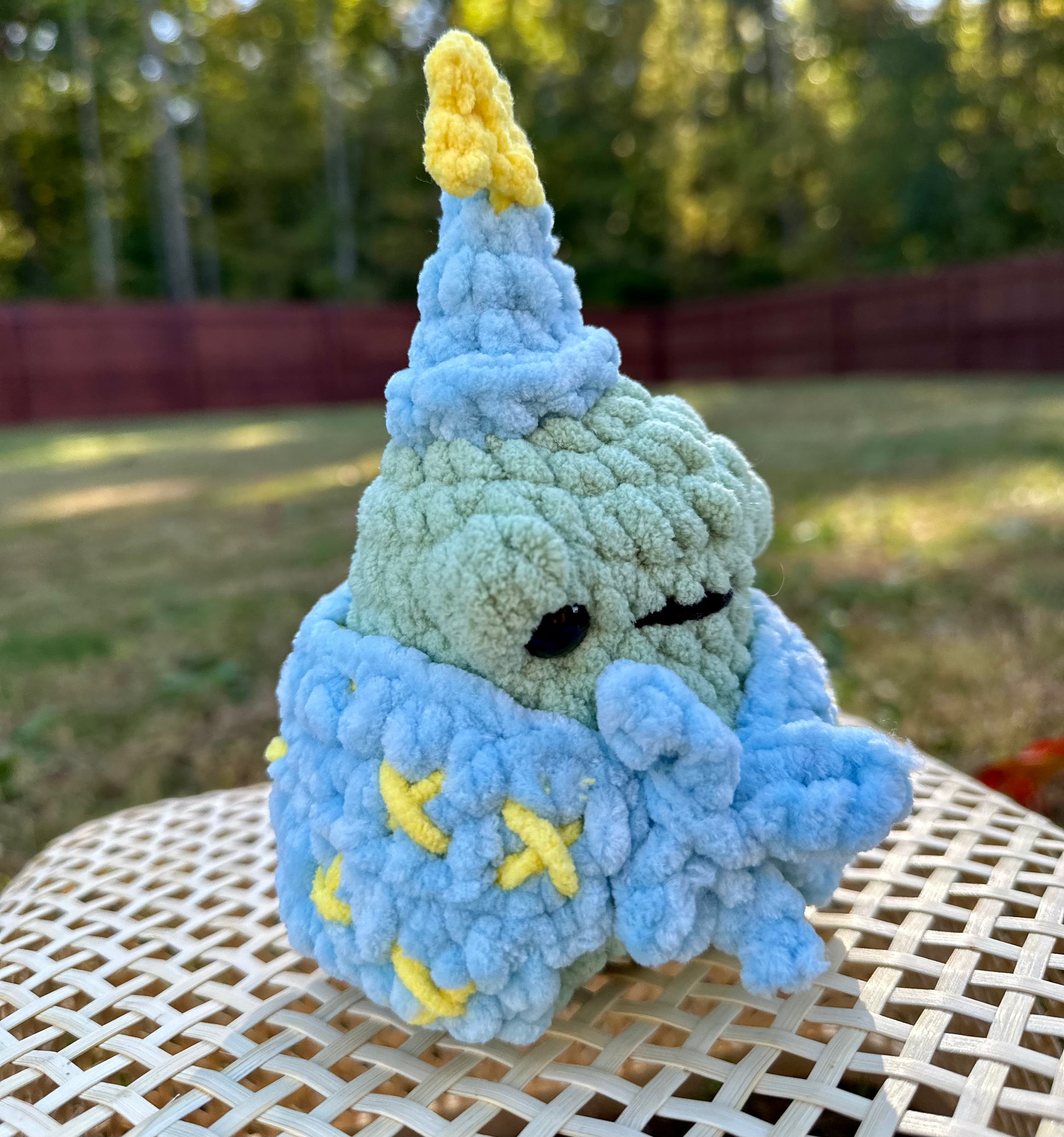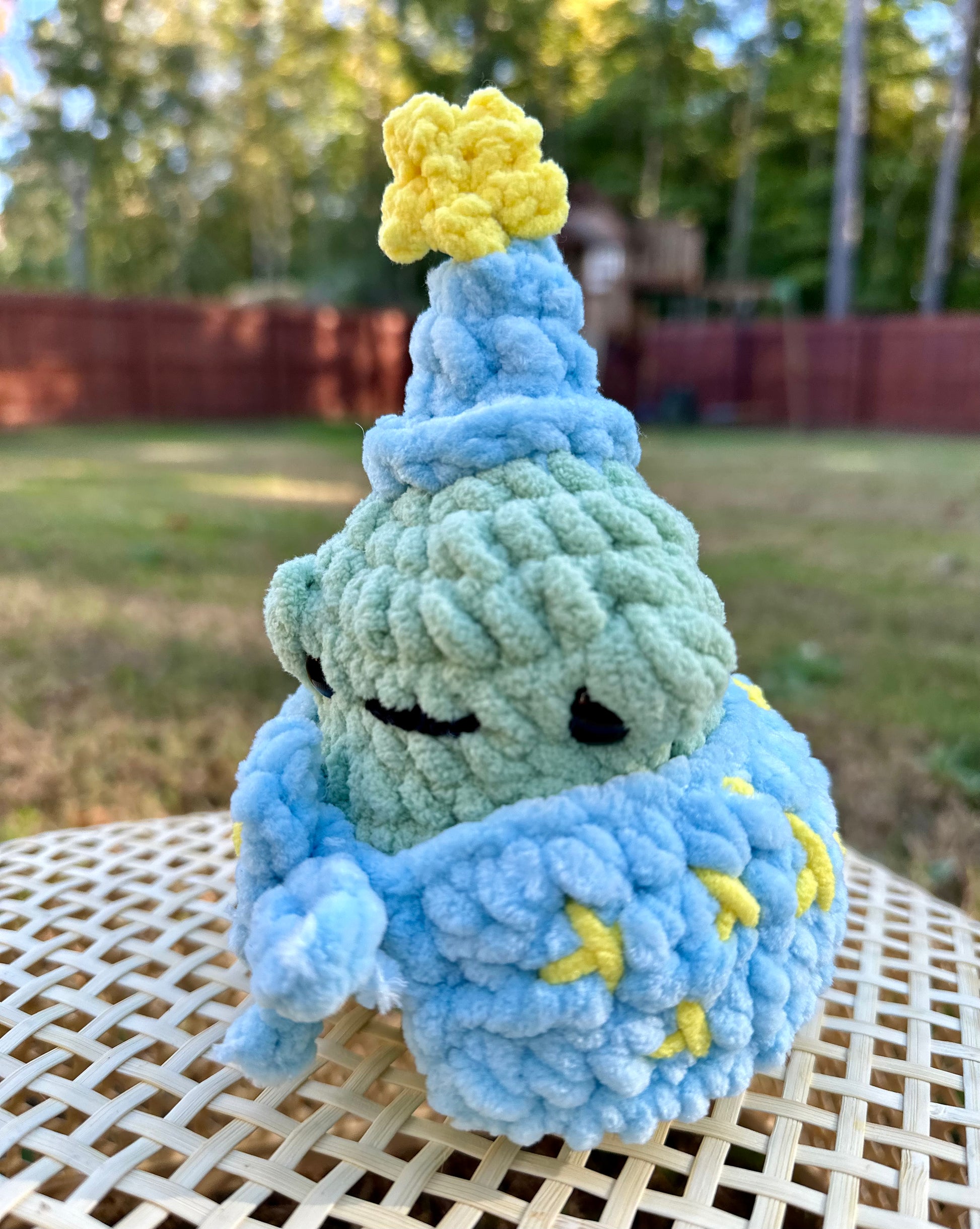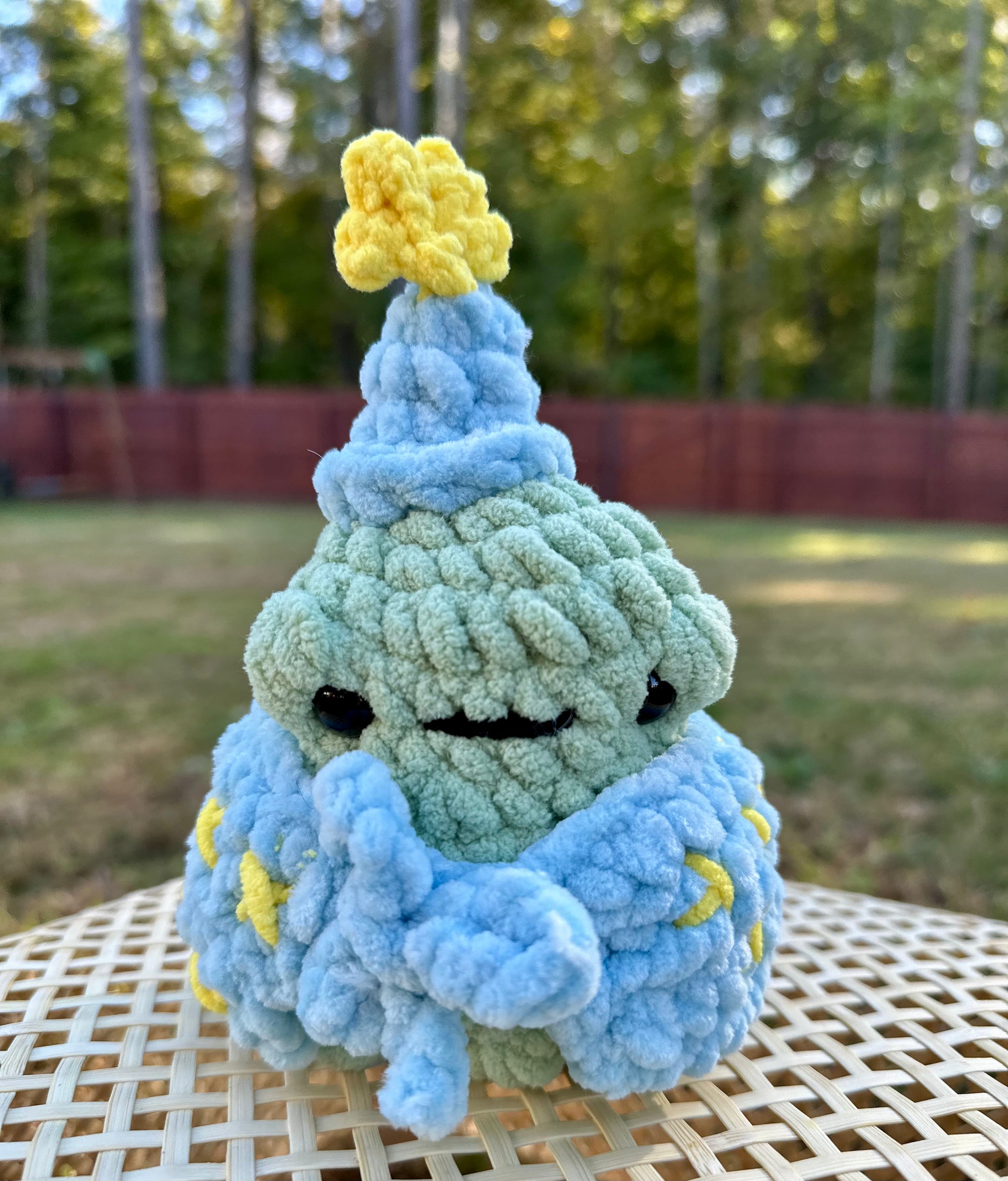 This 7-inch handmade crochet wizard frog is an enchanting addition to any collection. Its intricate design and attention to detail make it a unique and charming piece. Let this wizard frog cast a spell of whimsy and delight in your home.